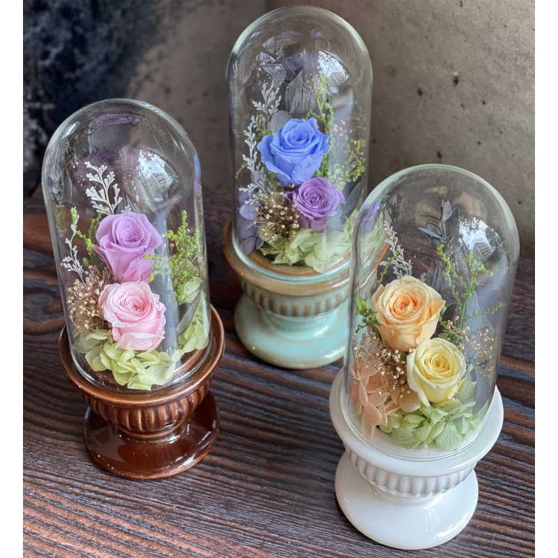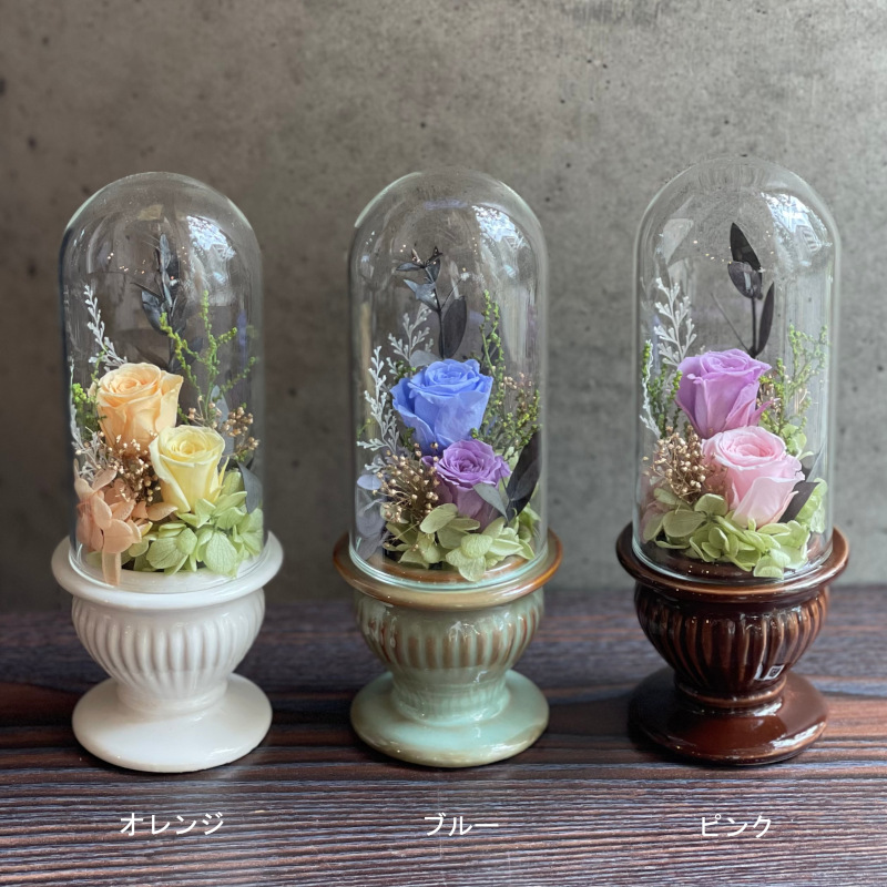 ガラスドームに入ったバラのアレンジメント。ガラスドームにより、アレンジをほこりから守ります。3色で展開してるのでお部屋の雰囲気でお選びいただけます。