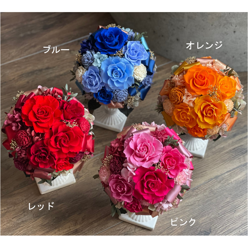 クラシカルな花器に華やかなローズをアレンジメントしたプリザーブドフラワー。ボリーュム感もありコロンと丸いアレンジメントは見るものすべてを魅了します。4色で展開しているのでお部屋に合わせてお選びください。