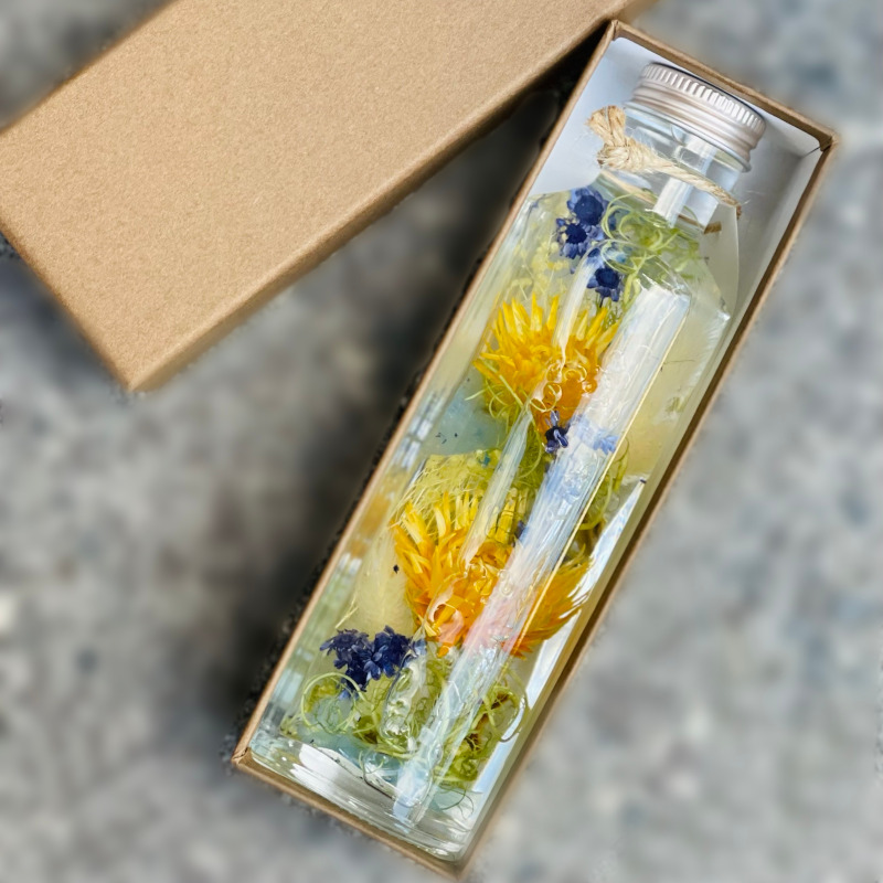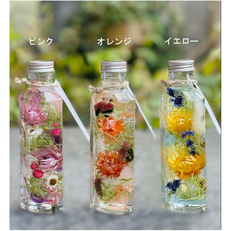 植物の色合いをより美しく魅せるハーバリウム。スリムなボトルにアレンジしました。小ぶりなのに存在感があるのでカフェやショップ、インテリアのディスプレイにオシャレです。光が差すとキラキラ輝いて癒される美しいハーバリウムです。