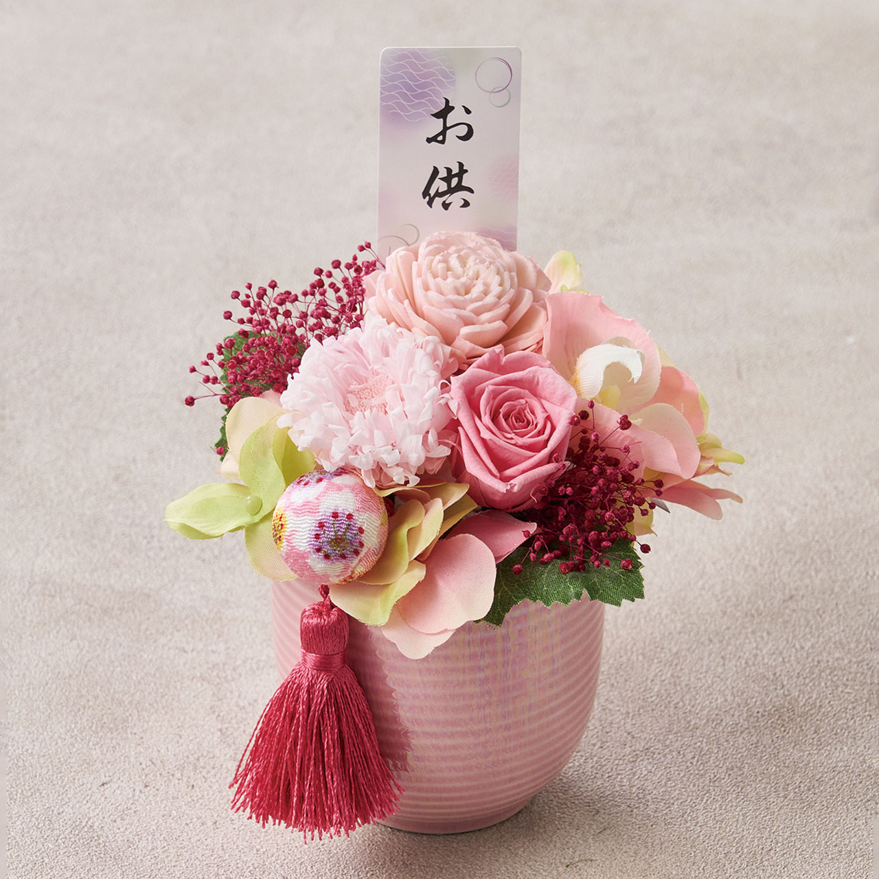 パープル、グリーン、ピンク、ホワイト4色展開のお供え用のアレンジメント。房をアクセントに付けました。丸みを帯びたコンパクトなサイズ感は小さなスペースの家庭祭壇にも飾っていただきやすく、また仰々しくなりすぎないご進物をお探しの方にも向いています。