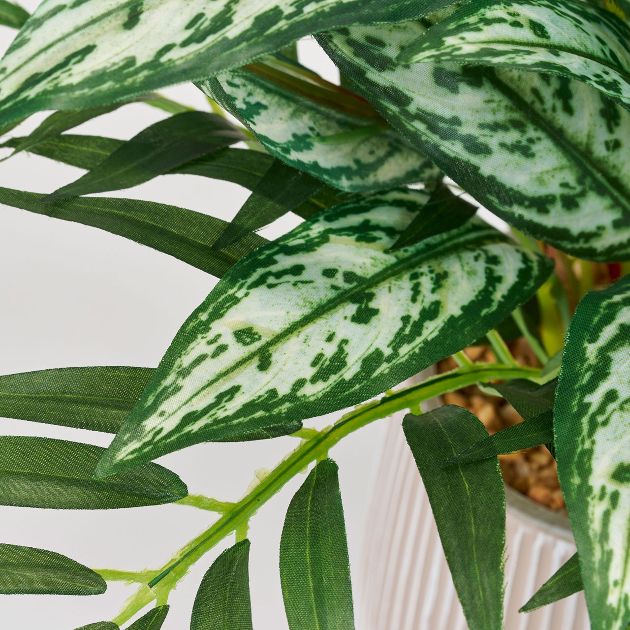 アグラオネマミックスリーフポットのアーティフィシャルフラワー(造花)です。2種類の葉が寄せ植えのように入ったミニサイズの観葉ポット。鉢は一見、陶器製のようにも見えますが、実はプラスチック製。安定感はあっても、軽くて割れにくいのでおすすめです。