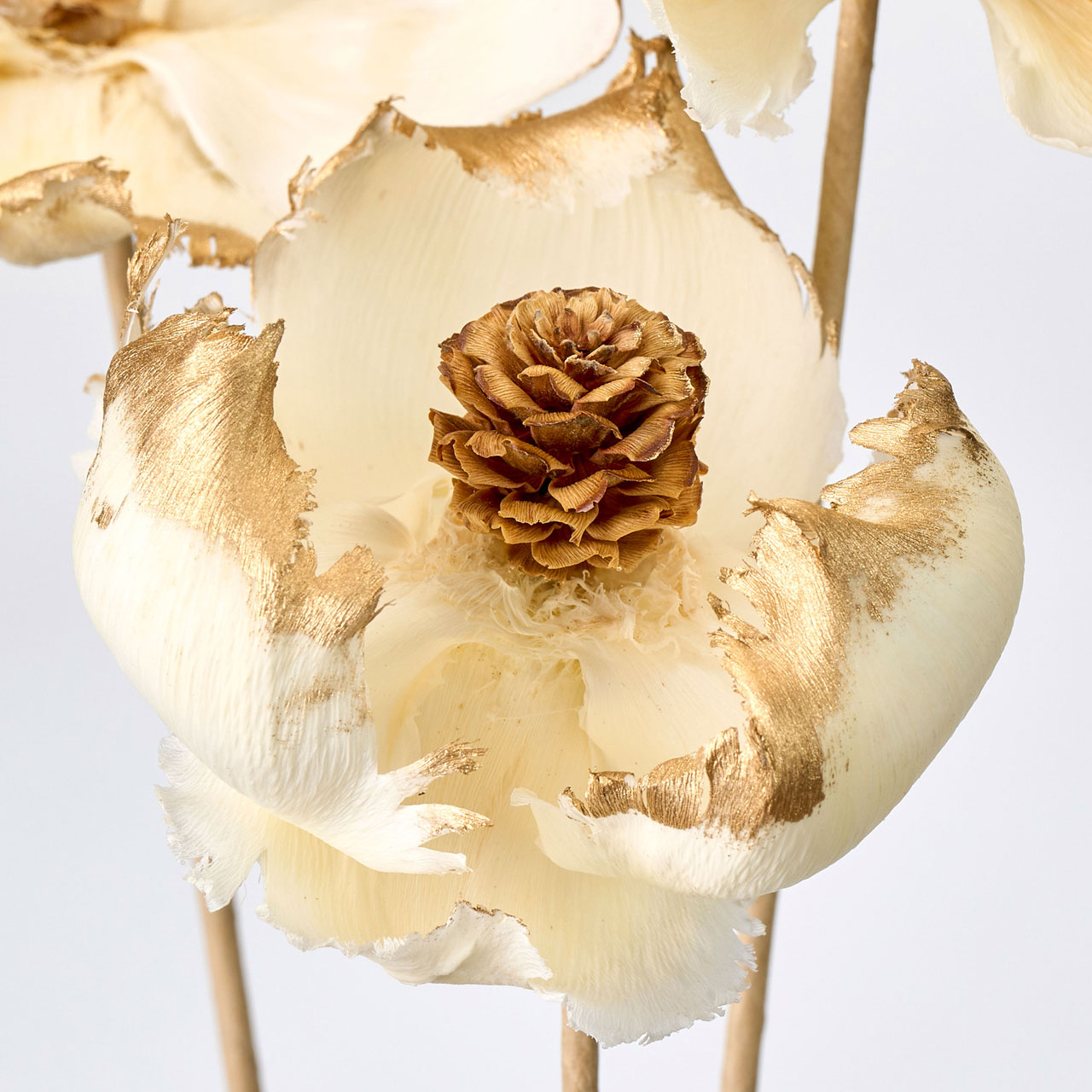 エッジゴールドのパームフラワー ソラフラワーのハンドメイドフラワー。天然素材で作られたハンドメイドフラワーは温かい風合いが魅力です。花びらはヤシの実の基部(付け根)、中心はサリグナムの実で出来ています。花びら部分のうちにゴールドのペイントを施しています。インテリアやアレンジメントのワンポイントにおすすめです。