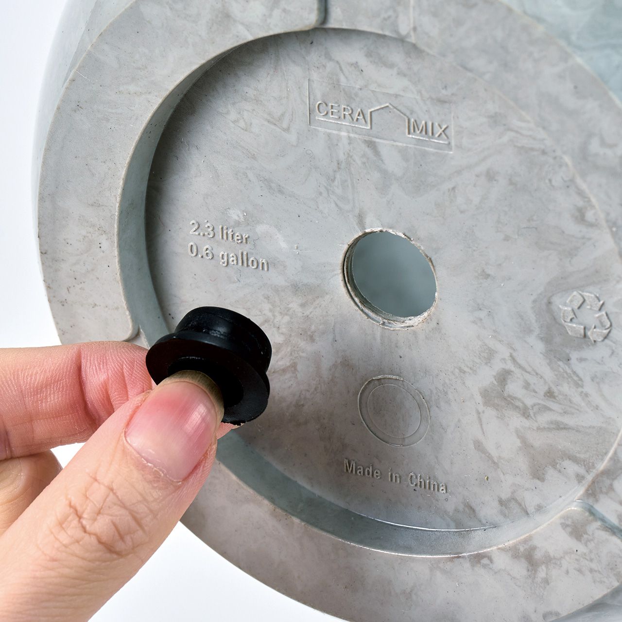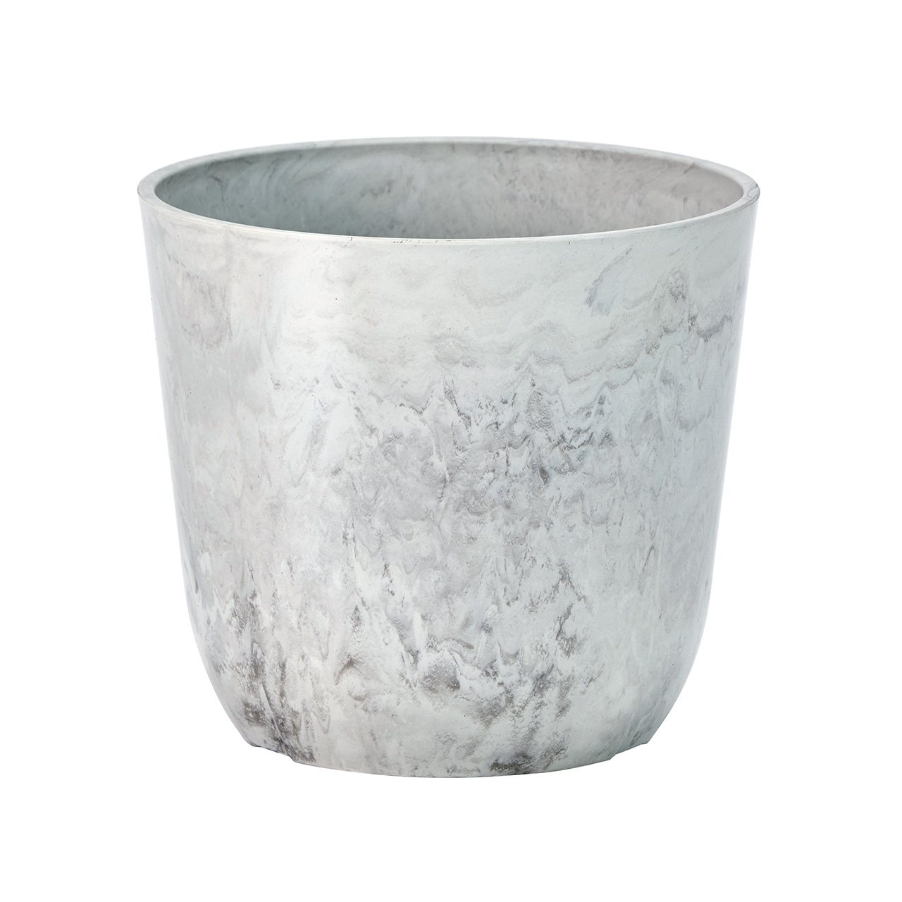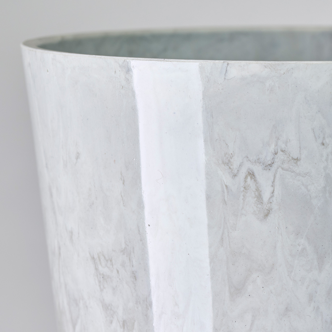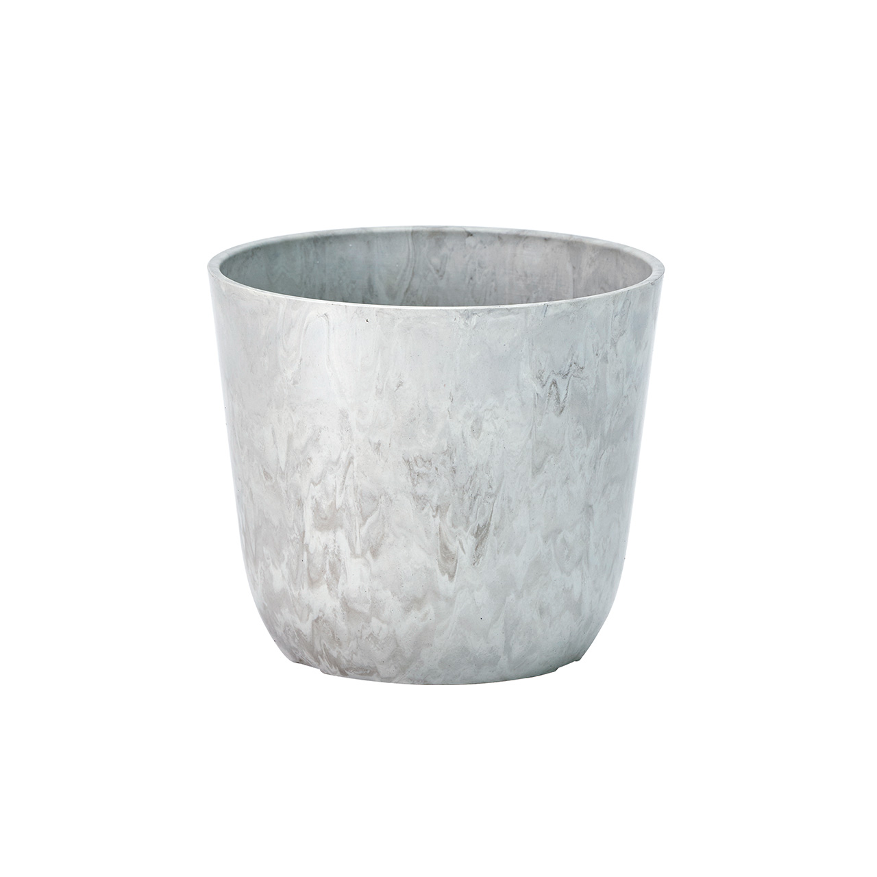 マーブル調に仕上げたライトグレーのプランターになります。天然素材の石粉とリサイクルプラスチックをおよそ6:4で使用した、環境負荷の少ないプランツポットになります。見た目のマーブル模様は大理石のような趣きがありながら、質感はプラスチックに近く比較的軽量で使用勝手のよいポットです。底穴付き、底穴キャップ付きとなりますので直植えも可能です。