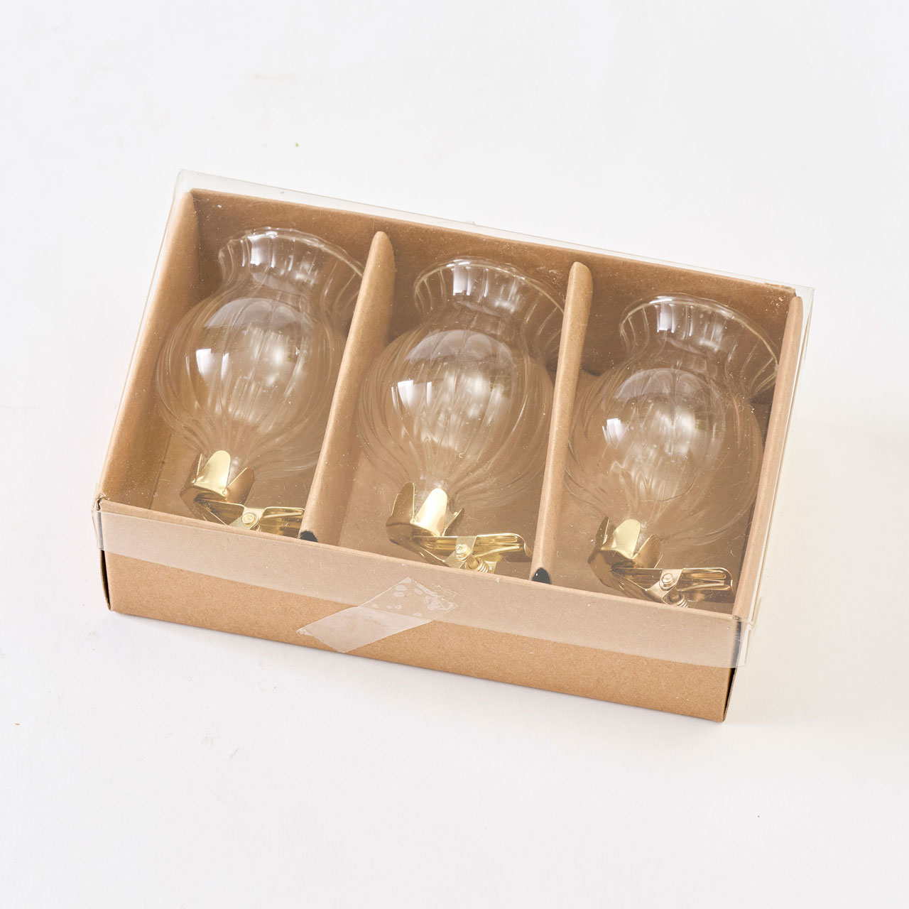 クリップ式のガラス製ミニ花器になります。3個セットになるので色々なシーンで使えます。繊細なデザインのガラス花器は、水を入れられるので生花も楽しめます。クリスマスツリーに挟んでオーナメント飾りにしてもお洒落です。挟む場所のアイディア次第で素敵なオブジェになります。