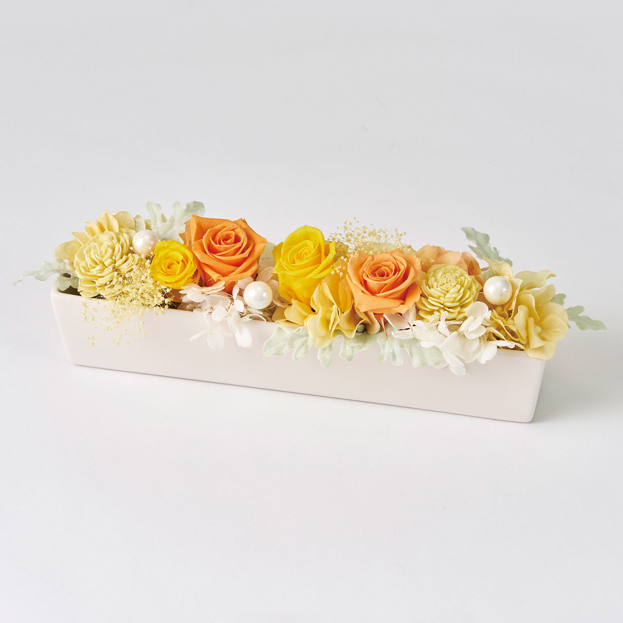 プリザーブドフラワーと可愛いホワイト花器を組み合わせたアレンジメント。