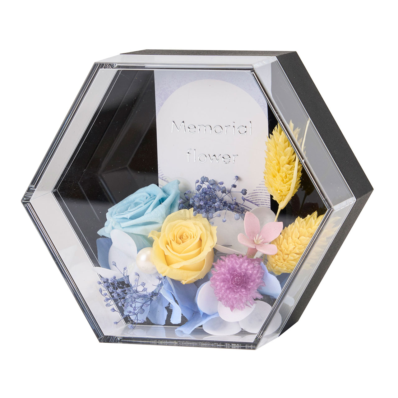 六角箱(ろっかくばこ)のアレンジメント。六角形の器を使用したエターナルアレンジ。飾りやすい形、サイズ感でインテリアとしてもおすすめ。