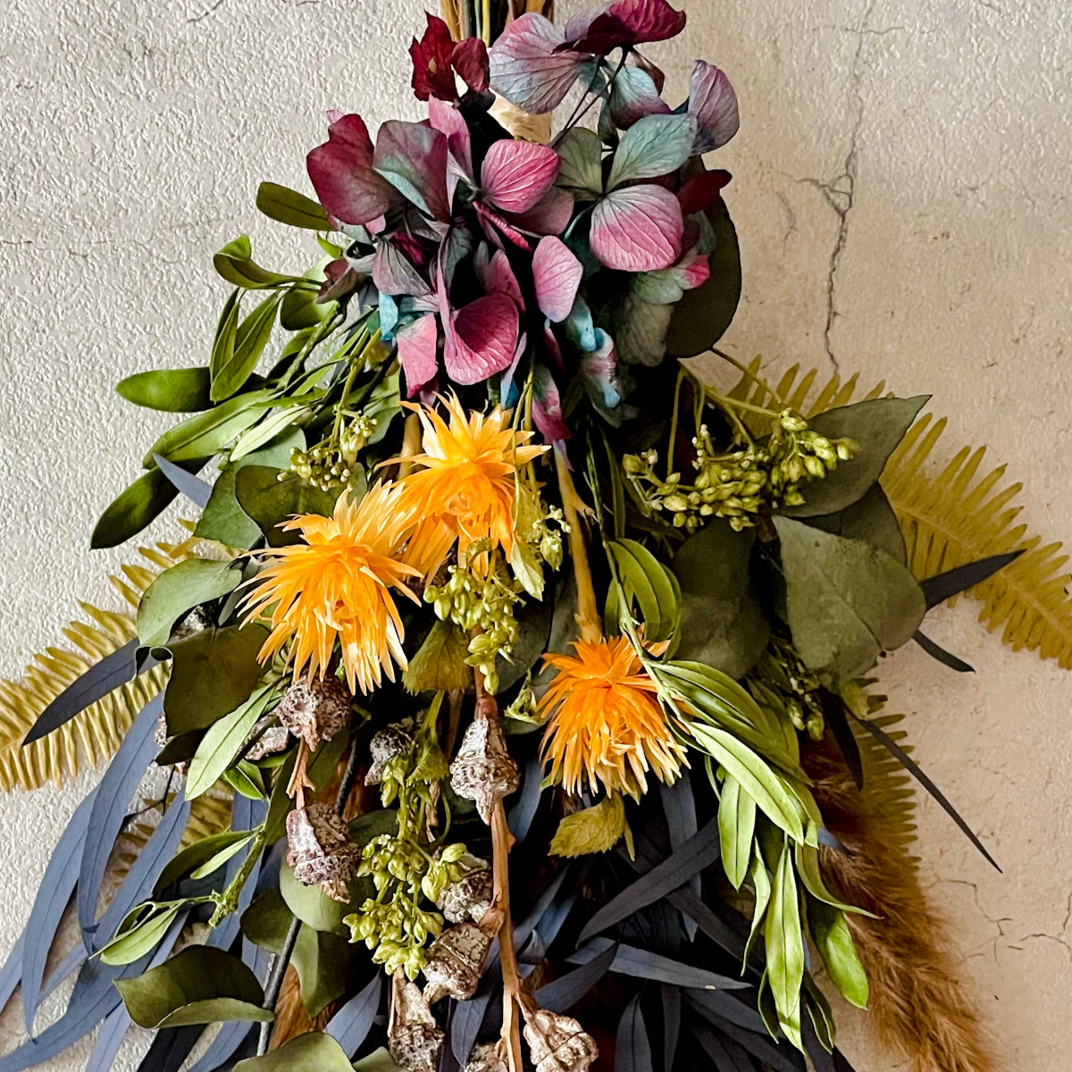 プリザーブド加工された花材を使った鮮やかなカラーのスワッグです。