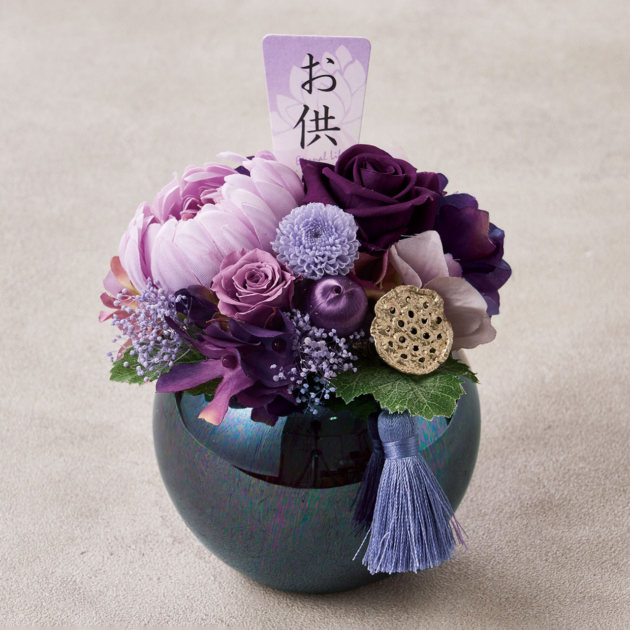 アレンジ、ベースともにコロンと丸いフォルムが可愛らしい供花アレンジメント。どんなお仏壇にもお供えできるコンパクトサイズに仕上げてあります。クリアケース入り。