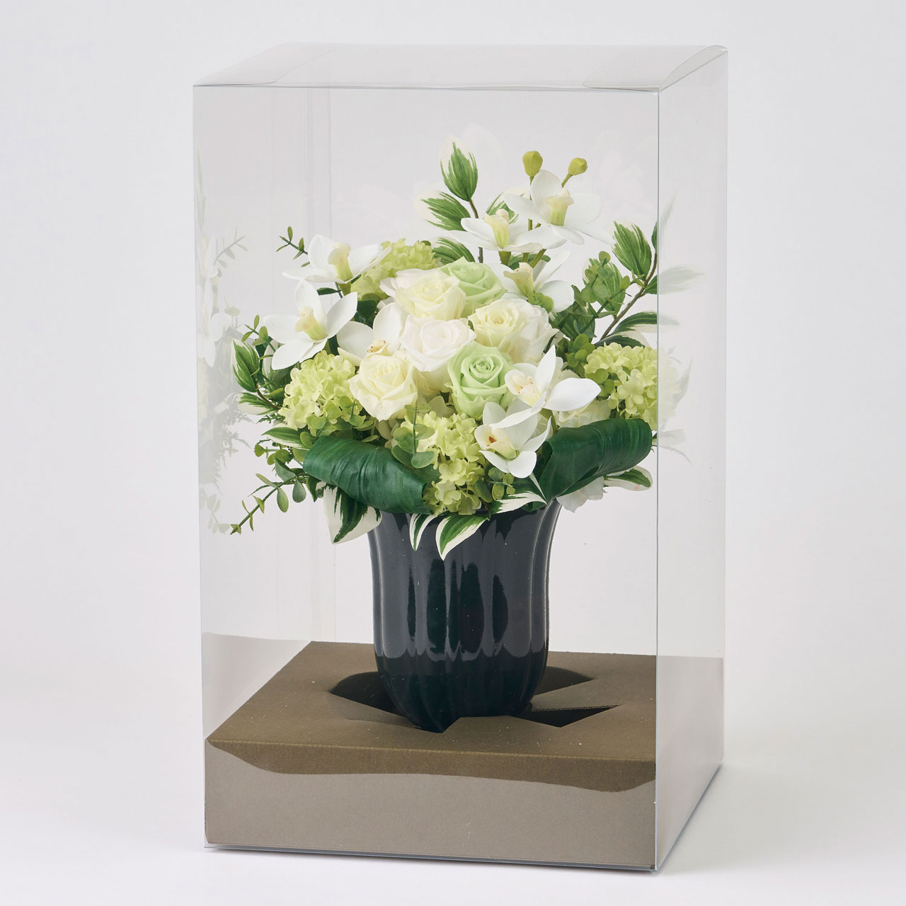 ご要望の多い大型の供花アレンジメント。白×緑の高貴な色合いで、ご進物にもおすすめです。クリアケース入りになります。