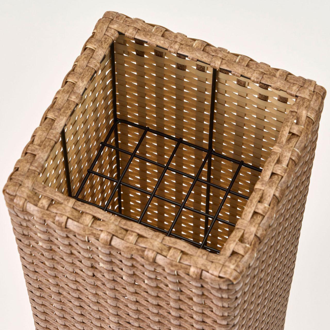 ライトブラウンのプラ編みプランター、鉢カバーです。ポリエチレン素材のため水をはじき、屋外でも使用することができるのでテラスやガーデニングにもおすすめ。鉢を置ける格子状のストッパーがついています。