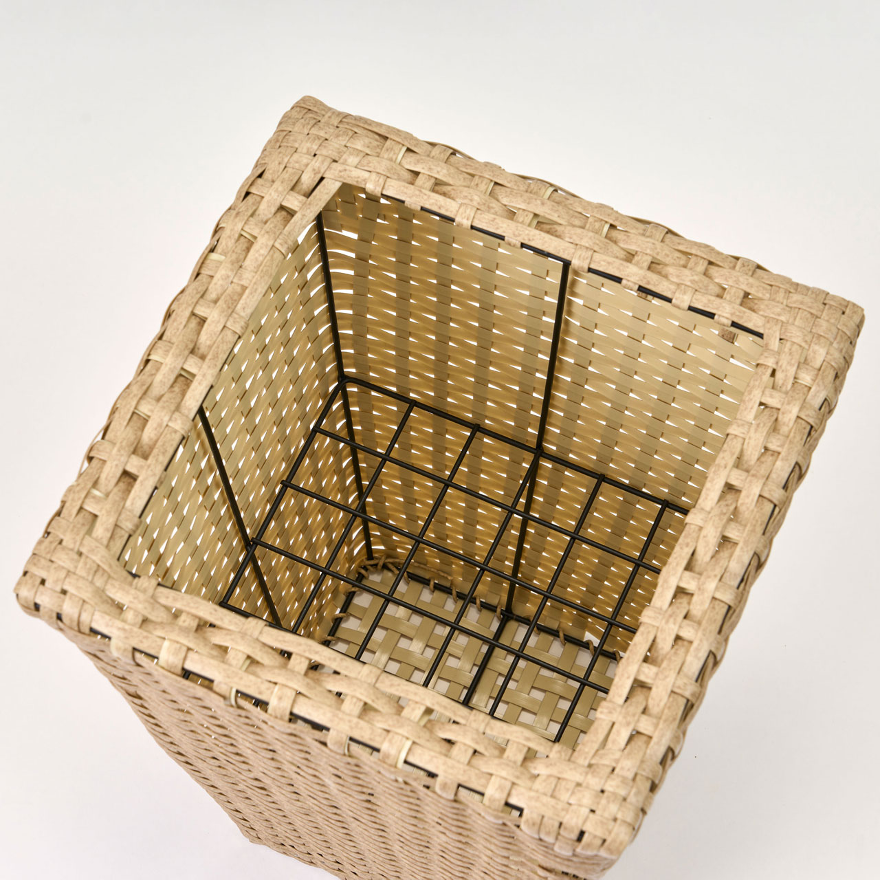 ナチュラル色のプラ編みプランター、鉢カバーです。ポリエチレン素材のため水をはじき、屋外でも使用することができるのでテラスやガーデニングにもおすすめ。鉢を置ける格子状のストッパーがついています。ケンガイ鉢6号対応。