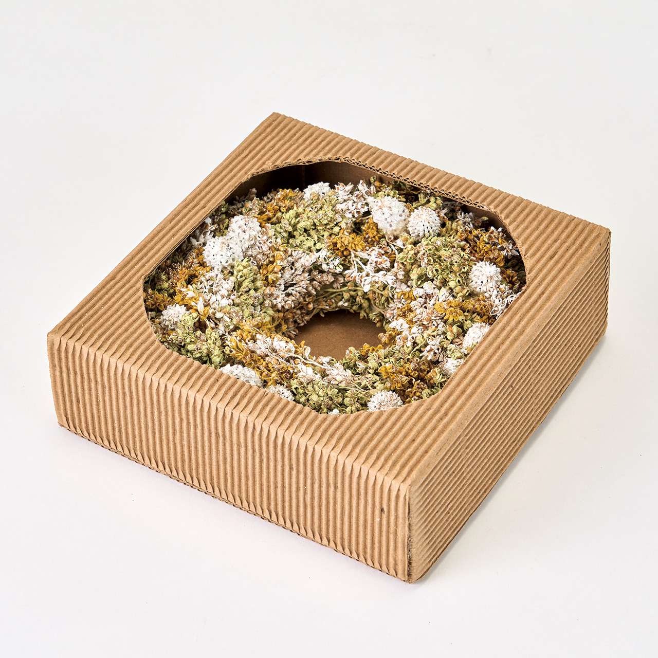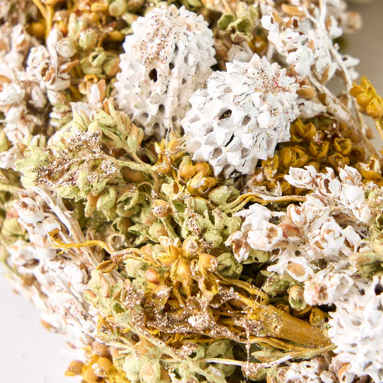 ホワイト、イエローのドライフラワーリース。細かな天然素材の花や木の実、グリーンなどにラメを施し、一つ一つ手作りでアレンジメントしたドライフラワーリースです。暖かみのある冬のインテリアにもおすすめ。ボックス入りですので、ギフトやプレゼントにも最適です。