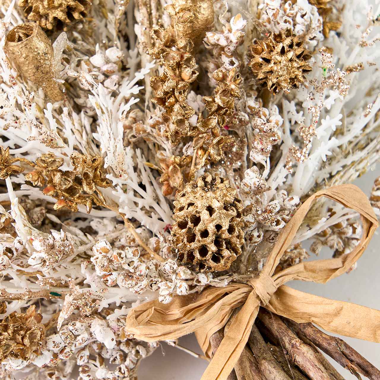 ホワイトゴールドのティンパードライフラワーブーケになります。細かな天然素材の花や木の実、グリーンなどにラメを施し、一つ一つ手作りでアレンジメントしたブーケタイプのアレンジメントです。