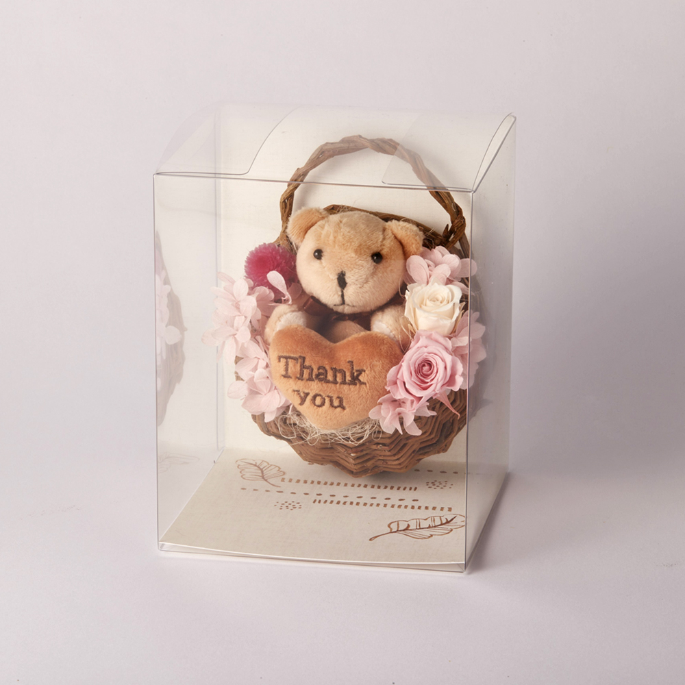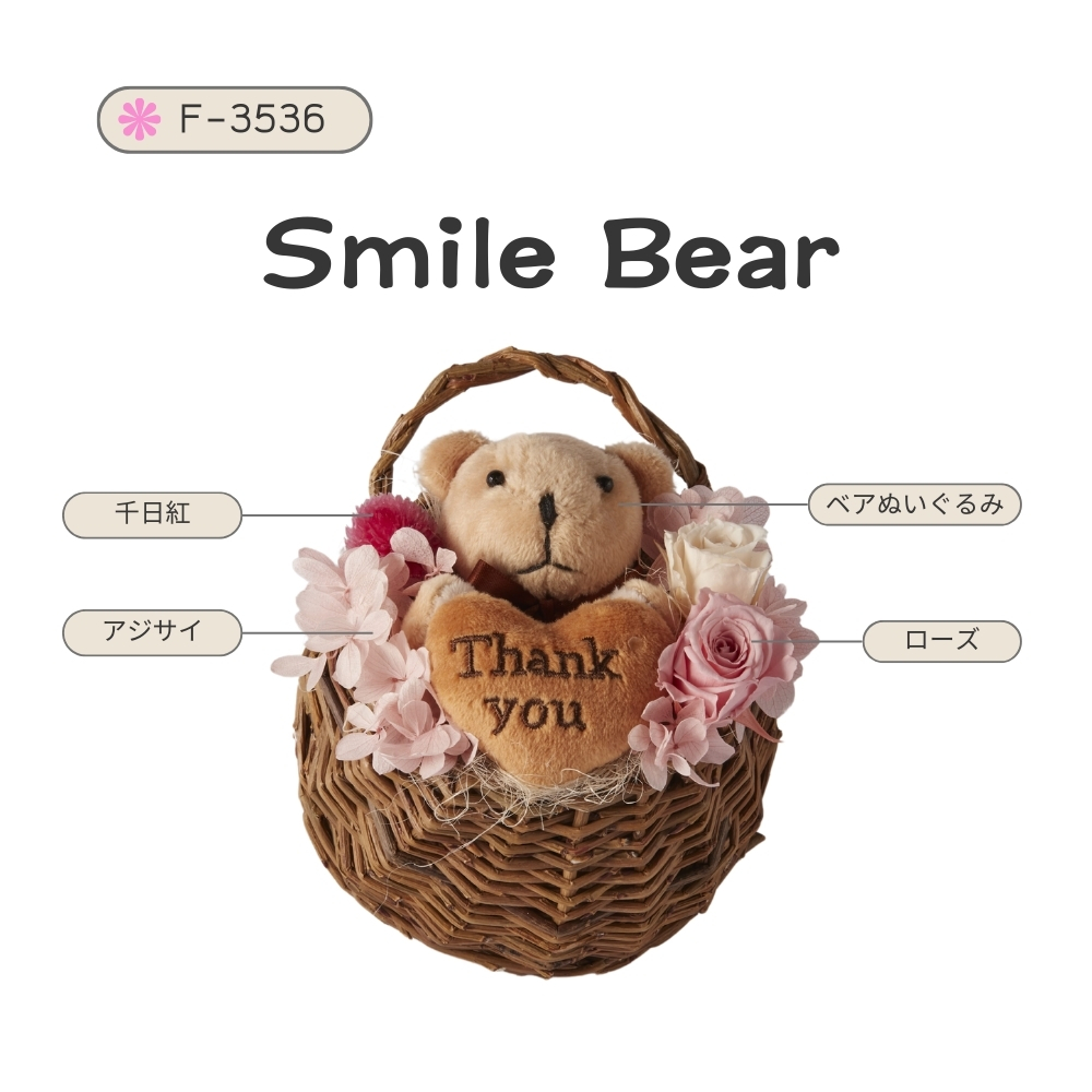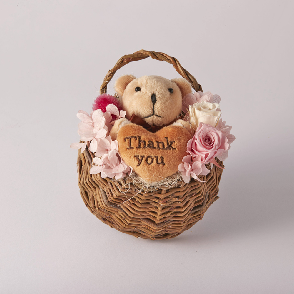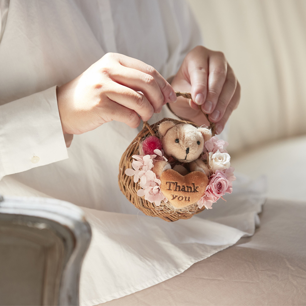 ハンドメイドのバスケットにスマイルベアと花を詰め込んだお洒落な壁飾り。目が合うと思わず頬が緩んでしまうような、かわいい壁飾りです。壁に取り付けるだけで可愛くて素敵な空間が完成します。