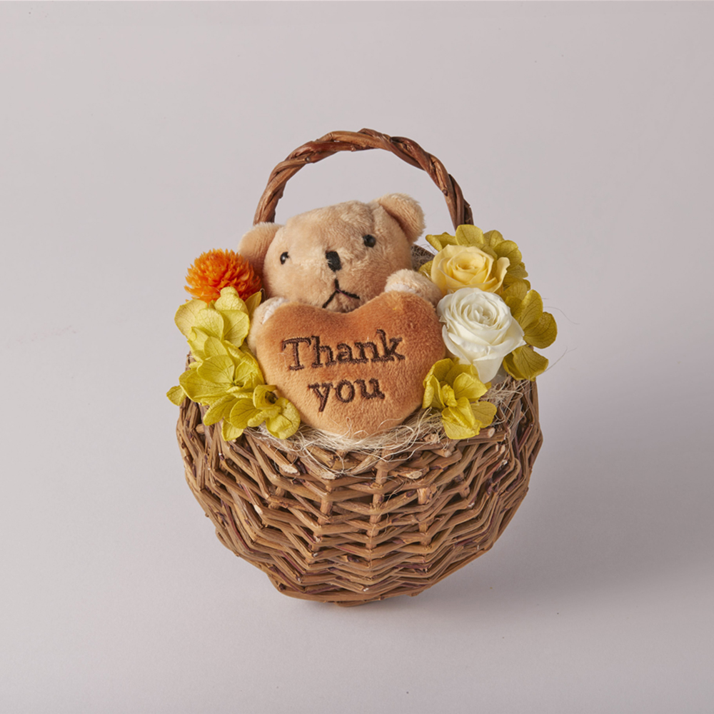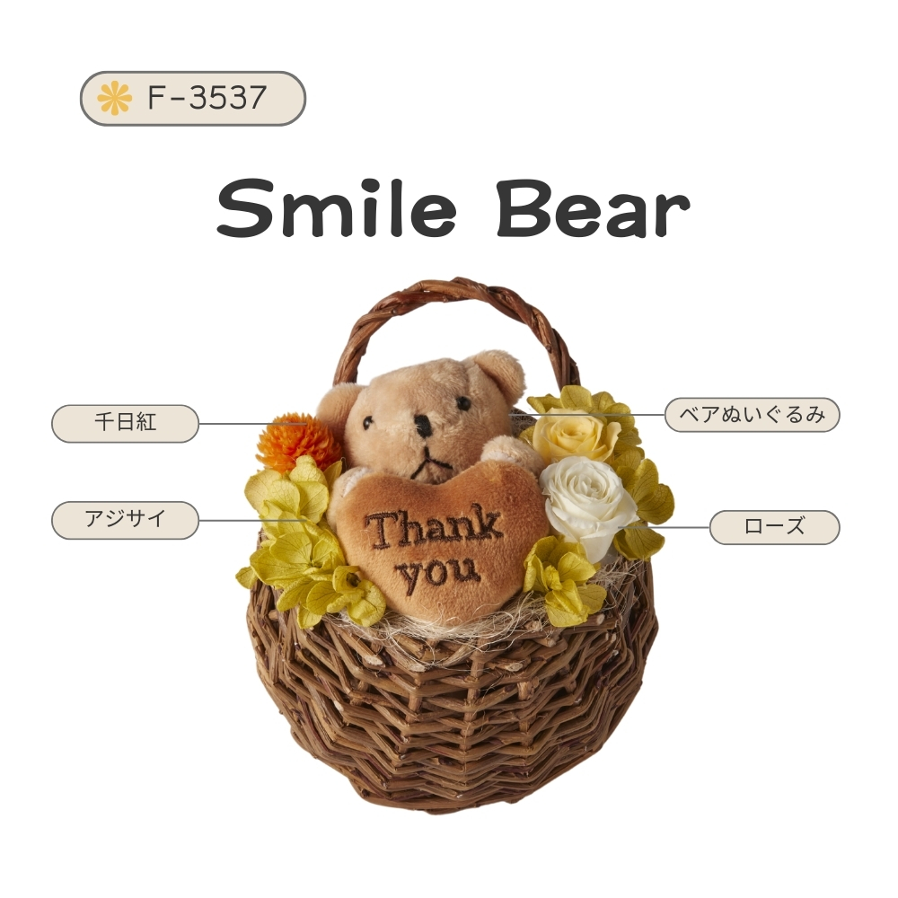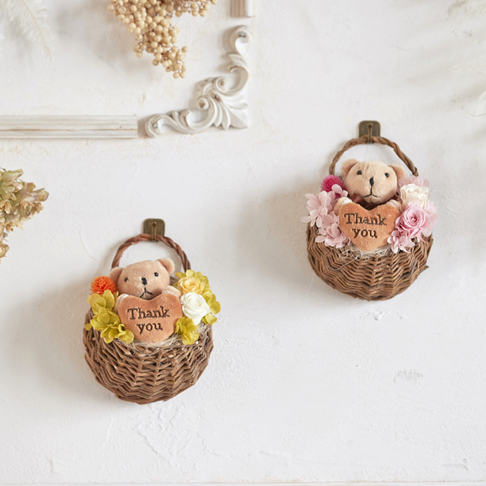 ハンドメイドのバスケットにスマイルベアと花を詰め込んだお洒落な壁飾り。目が合うと思わず頬が緩んでしまうような、かわいい壁飾りです。壁に取り付けるだけで可愛くて素敵な空間が完成します。