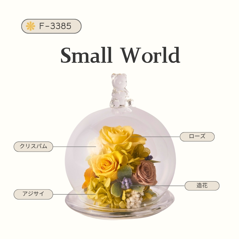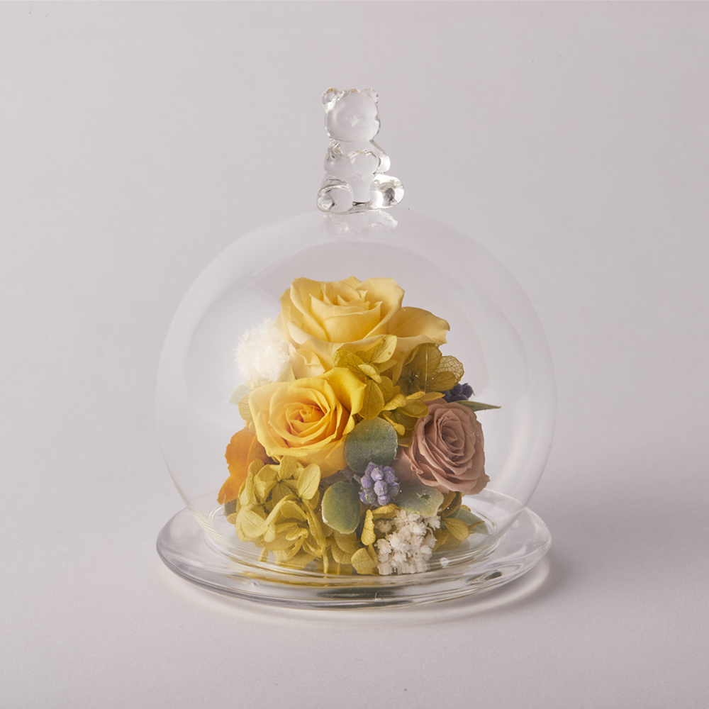 可愛いガラスドームの中にプリザーブドフラワーをアレンジしたお洒落なオブジェ。ガラスの蓋の上にはベアがちょこんと座っている可愛いデザイン。ガラスの蓋は固定されていないので、別の用途で使うことも可能です。