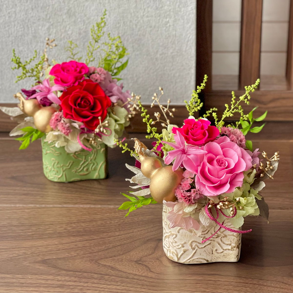 福を招く豆ひょうたんと薔薇のプリザーブドフラワーをクラシカルな器にアレンジしました。縁起物として喜ばれる豆ひょうたんをアレンジすることで運気もアップ。アンティーク感のある花器もお洒落です。