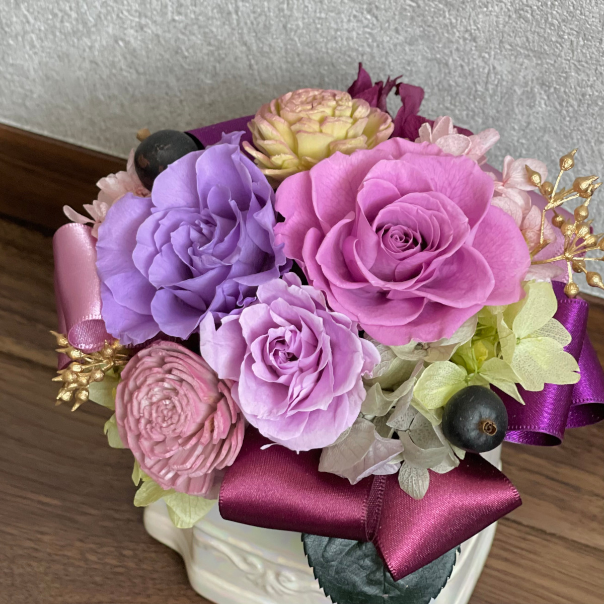 プリザーブドフラワーと可愛いホワイト花器を組み合わせたアレンジメント。