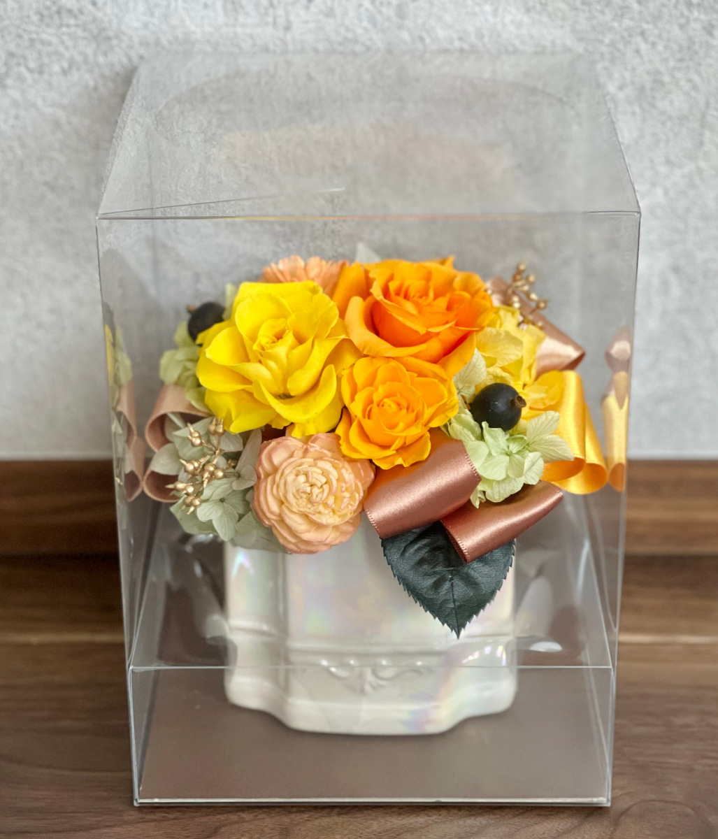 ケーキのように彩り鮮やかなアレンジをアクリル×天然木に閉じ込めました。