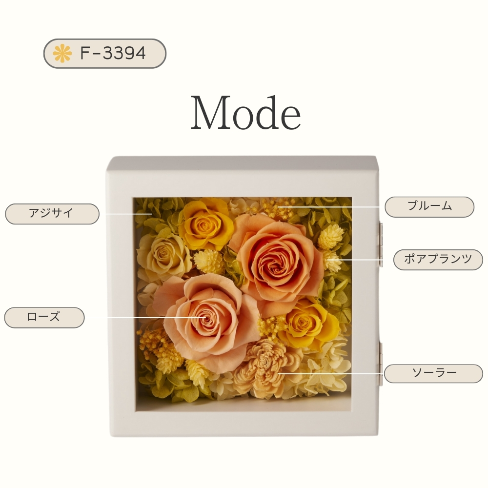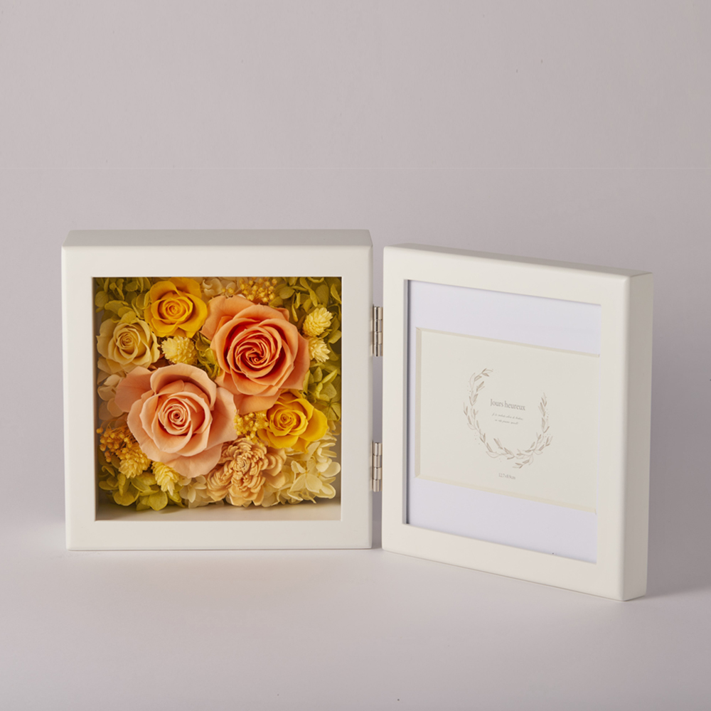 正方形のボックスにプリザーブドフラワーを敷き詰め、写真と一緒に飾れるお洒落なアイテム。