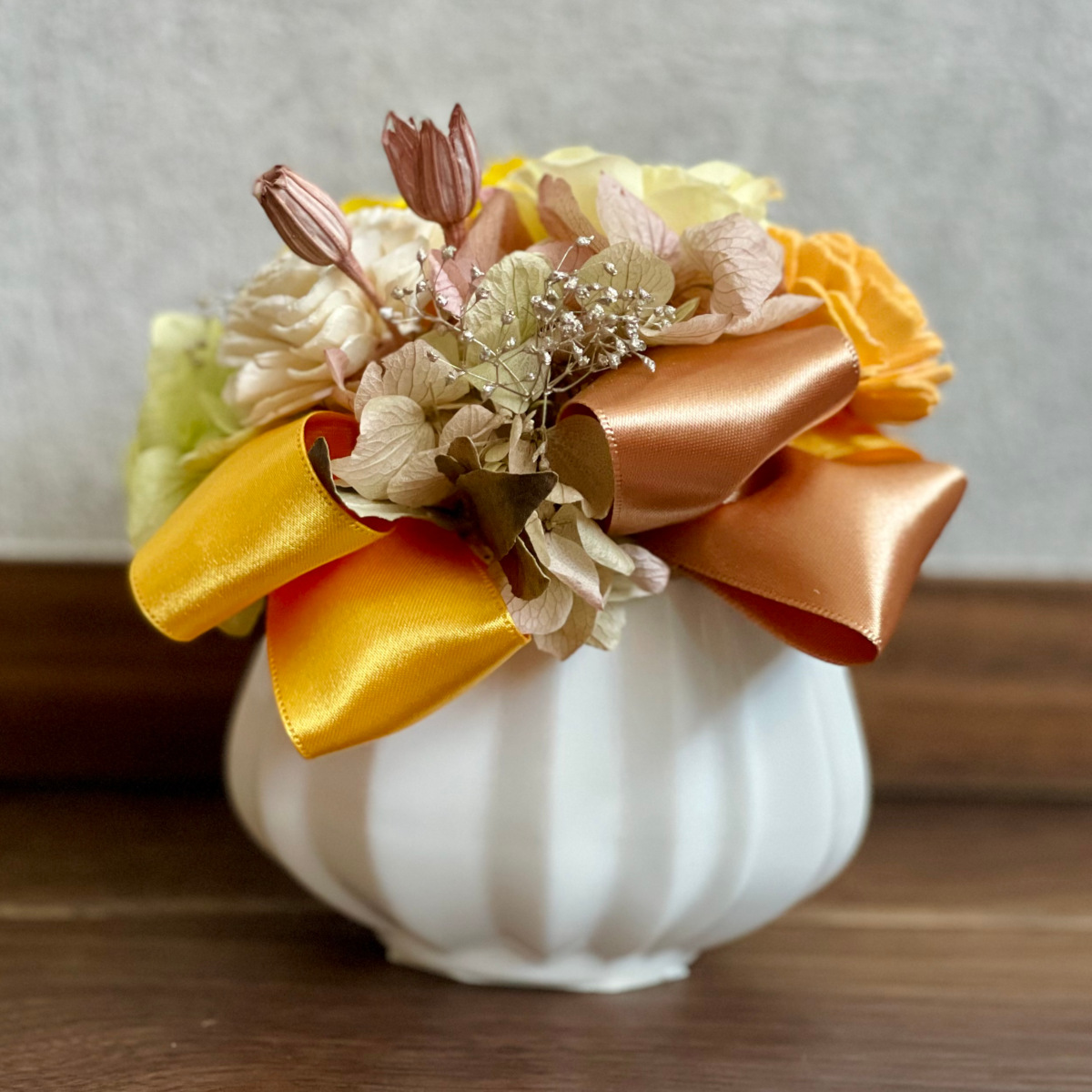 プリザーブドフラワーと可愛いホワイト花器を組み合わせたアレンジメント。