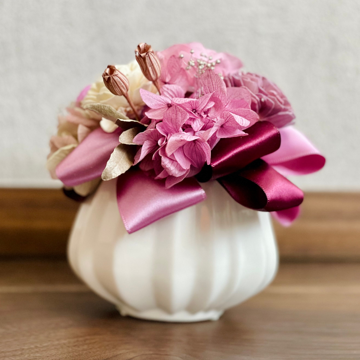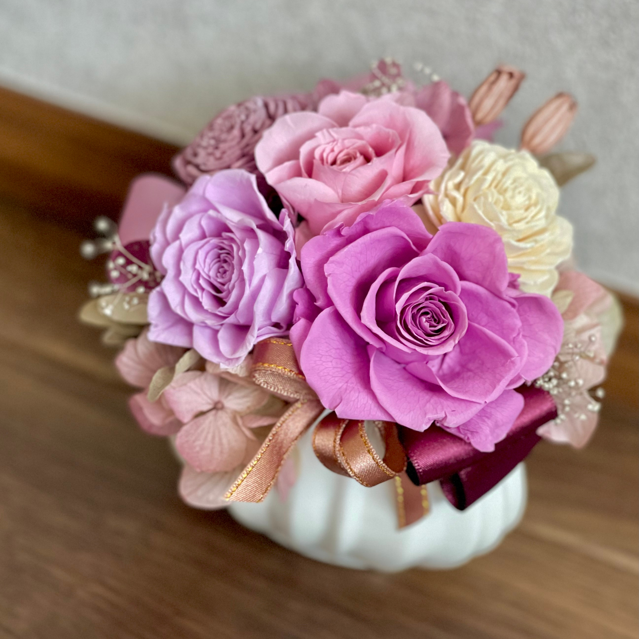プリザーブドフラワーと可愛いホワイト花器を組み合わせたアレンジメント。