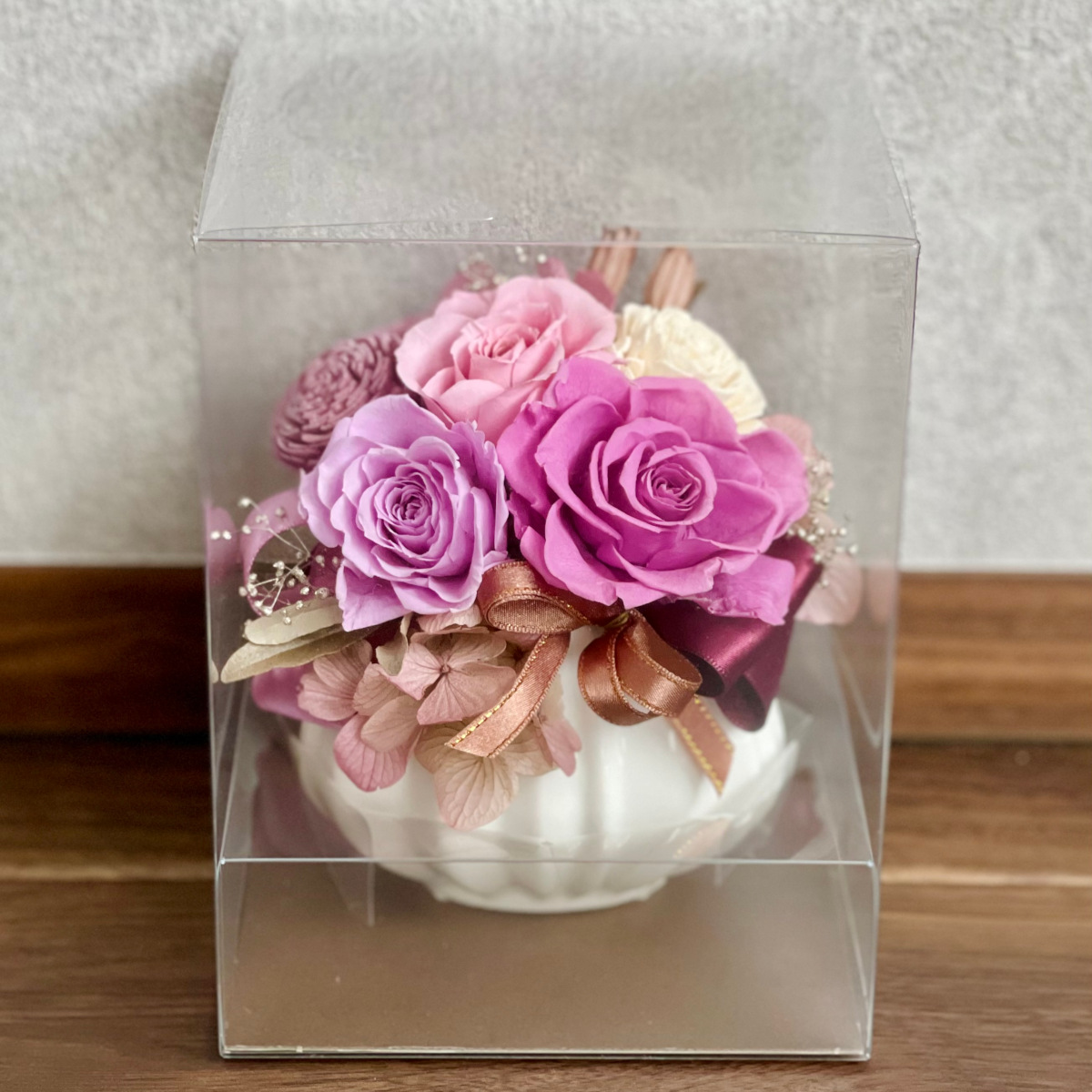 ケーキのように彩り鮮やかなアレンジをアクリル×天然木に閉じ込めました。