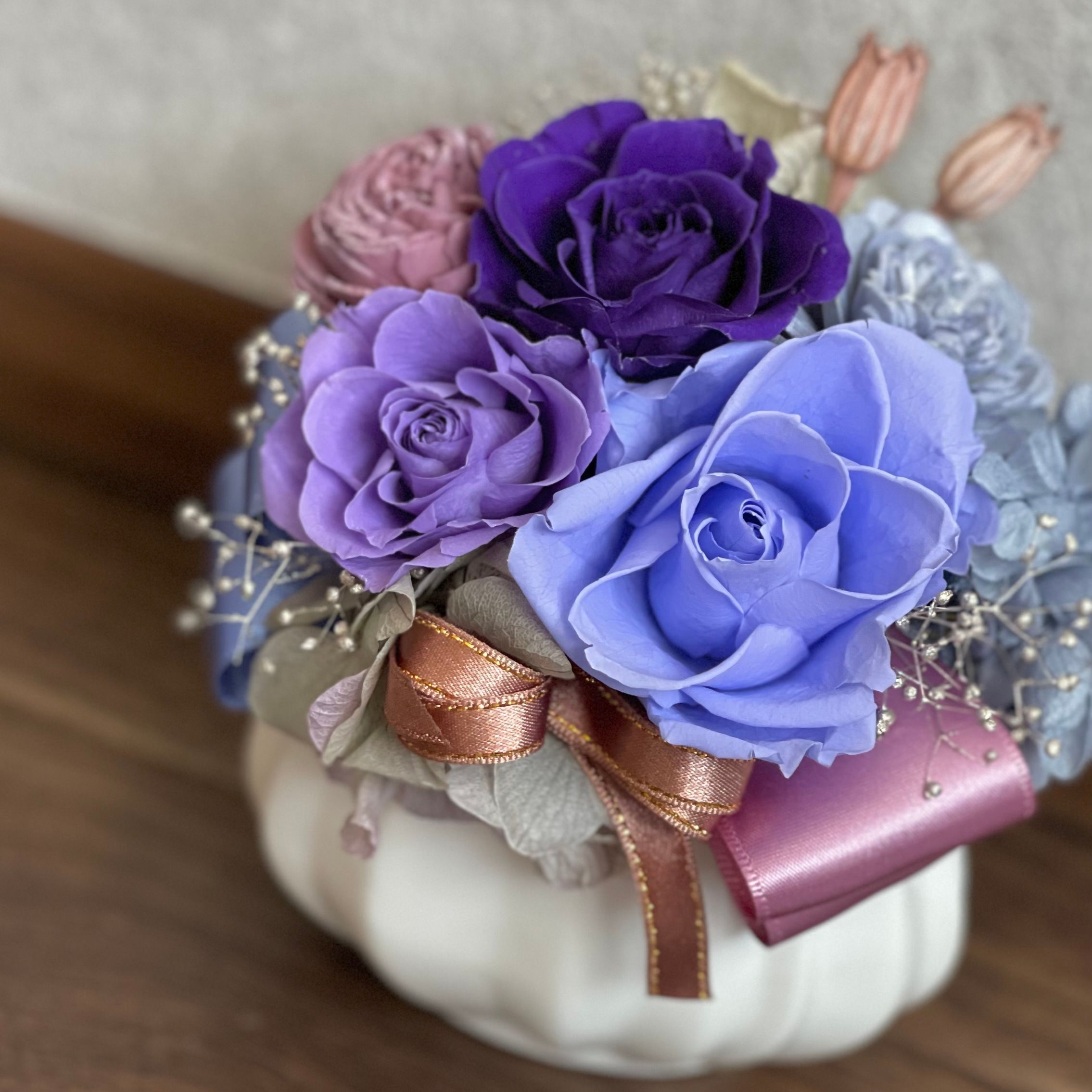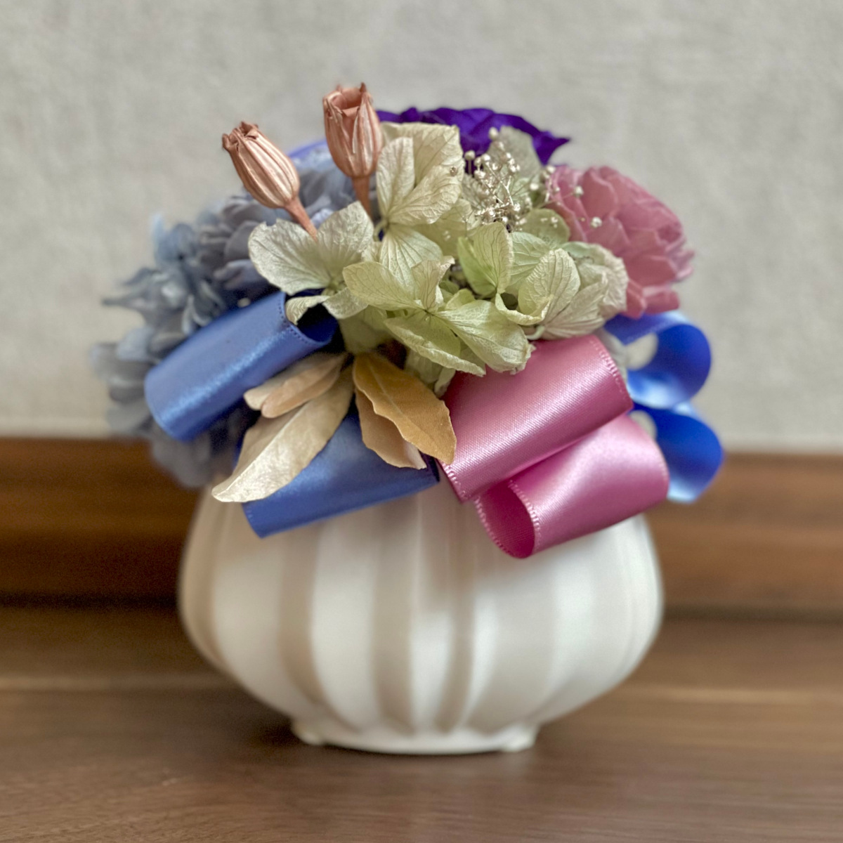 プリザーブドフラワーと可愛いホワイト花器を組み合わせたアレンジメント。