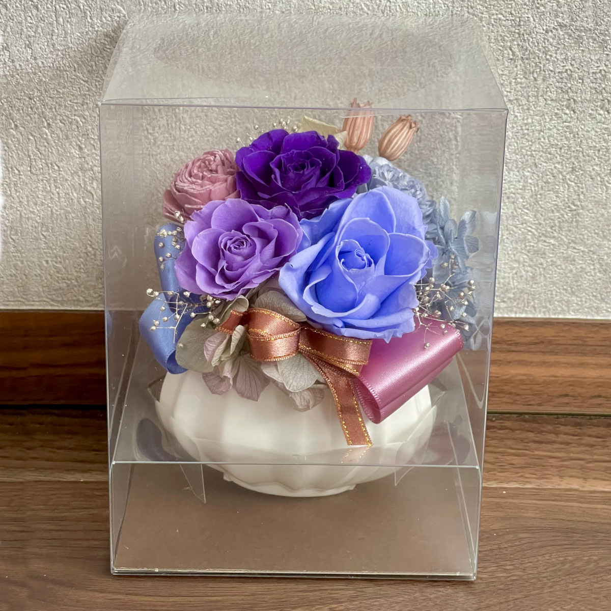 可愛いくデザインしたプリザーブドアレンジメント(ブルー)