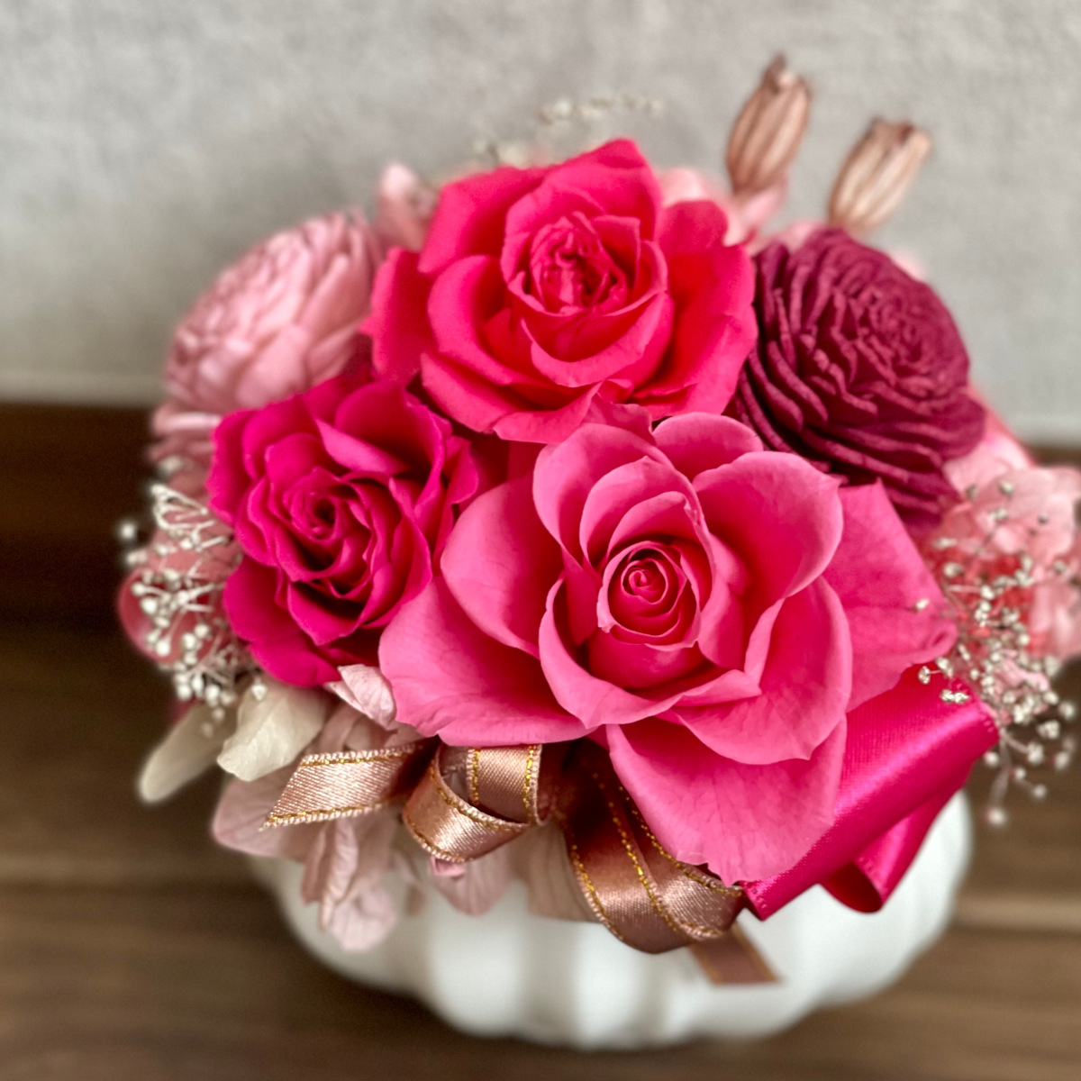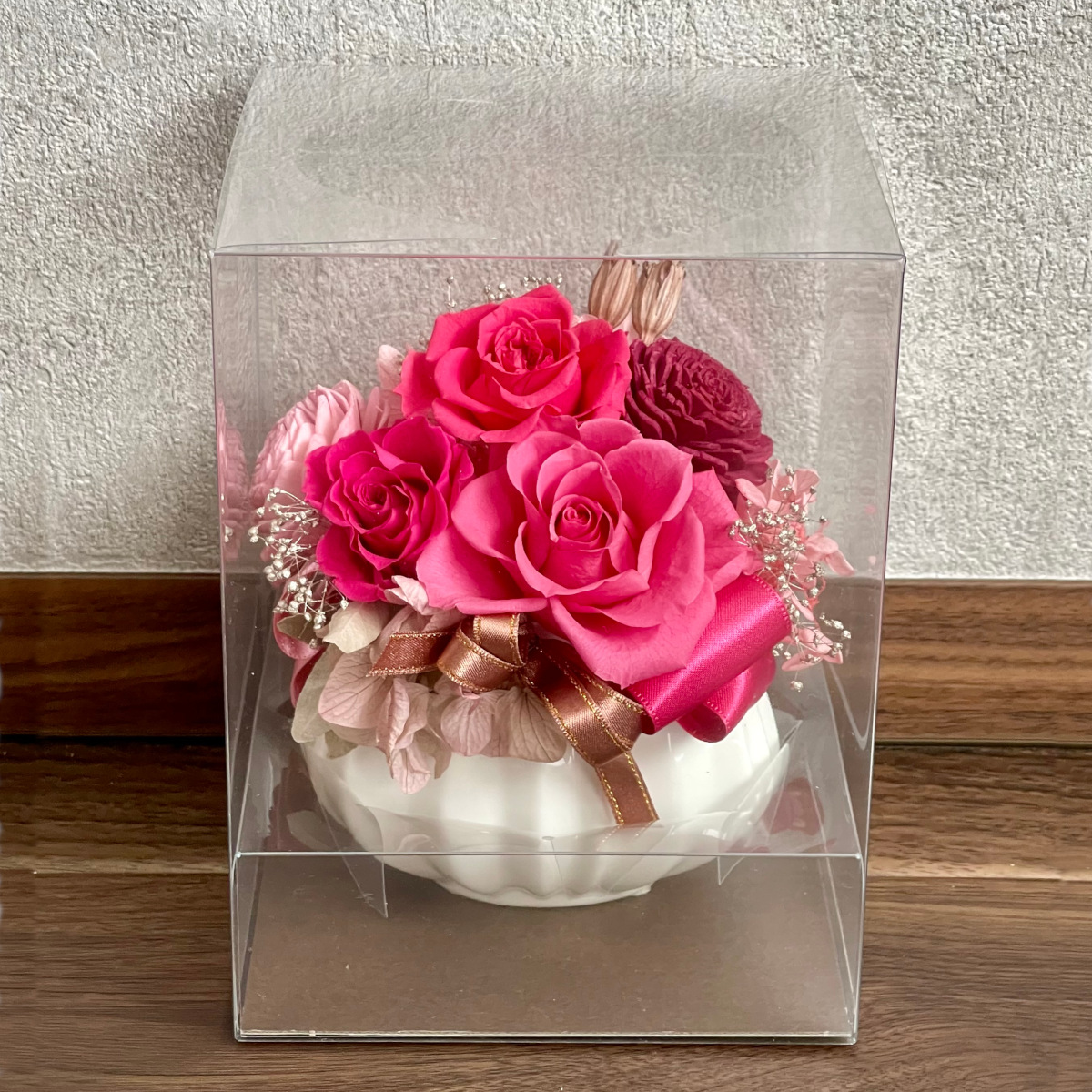 可愛いくデザインしたプリザーブドアレンジメント(ラズベリーピンク)