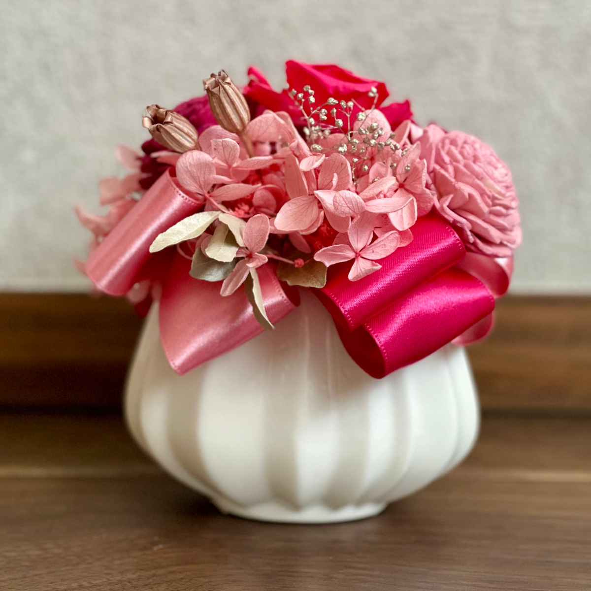 プリザーブドフラワーと可愛いホワイト花器を組み合わせたアレンジメント。