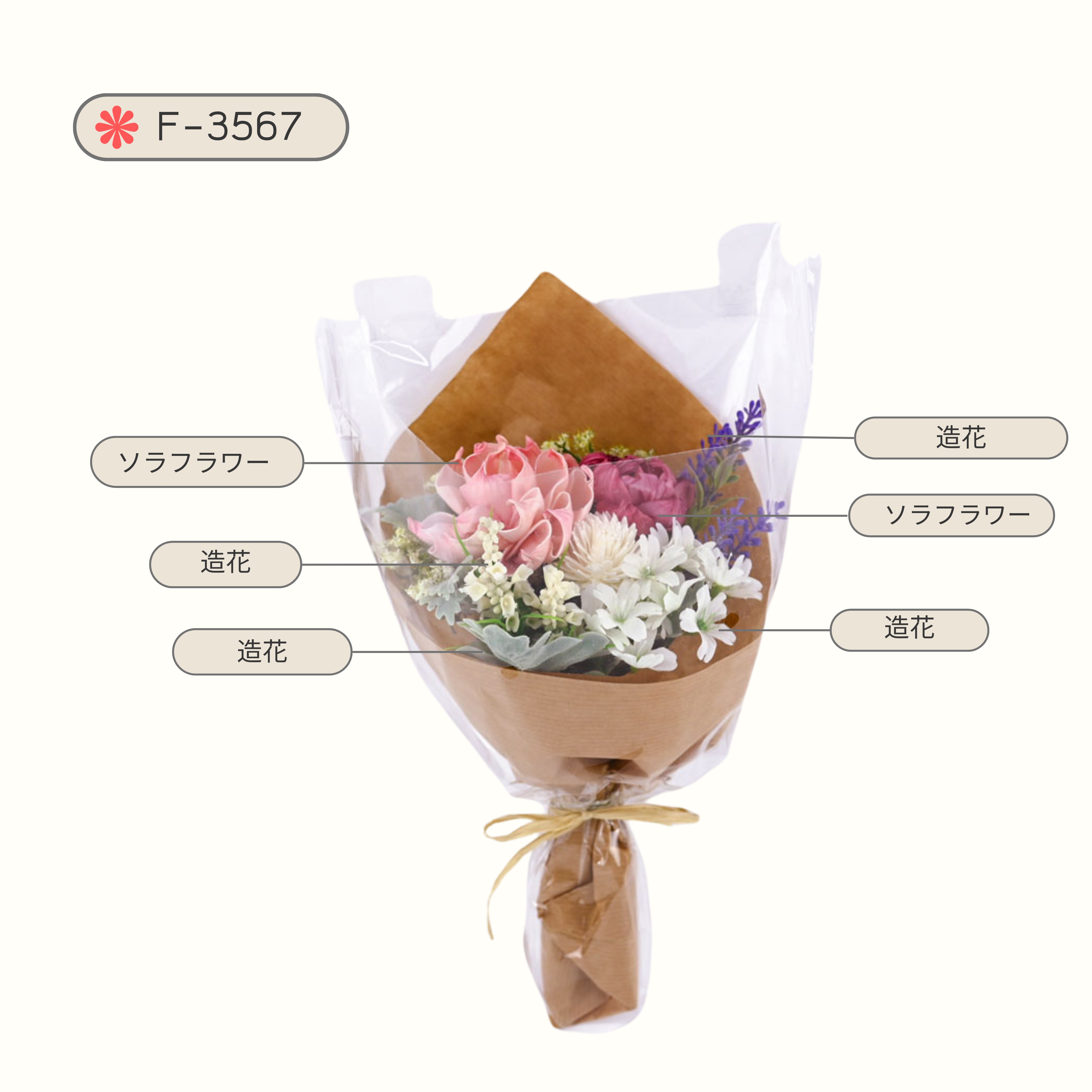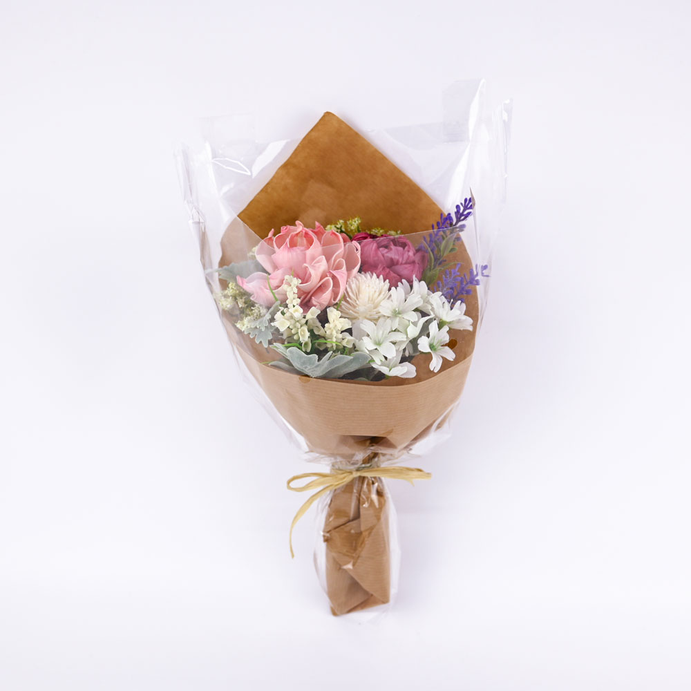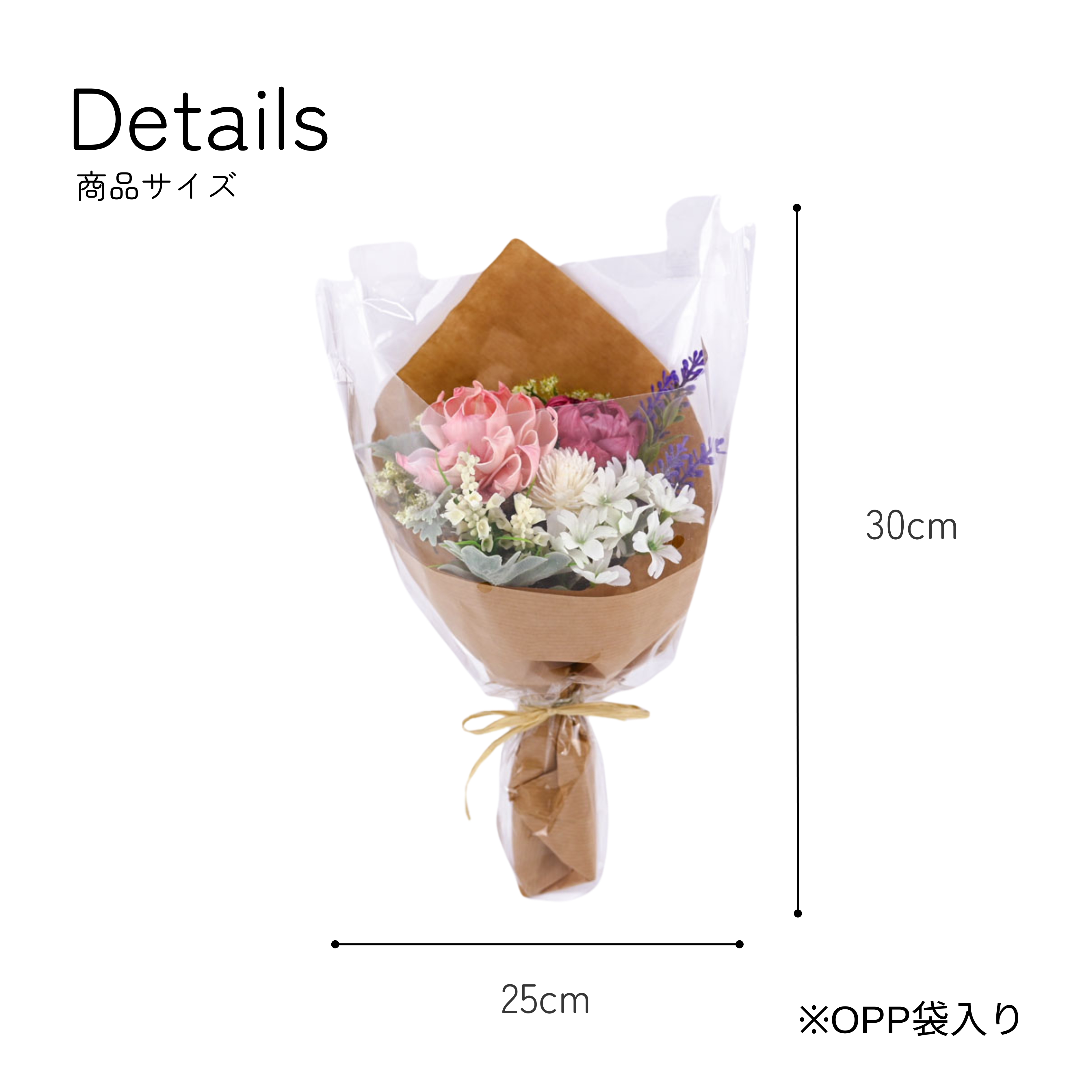 アーティフィシャルフラワー(造花)を使ったお洒落なブーケ。造花ならではで季節やご用途も気にせず、あらゆるシーンでご利用いただけます。季節を問わずお持ちいただける、素敵なブーケです。完成品ブーケですのでそのまま気軽にお使いいただけます。
