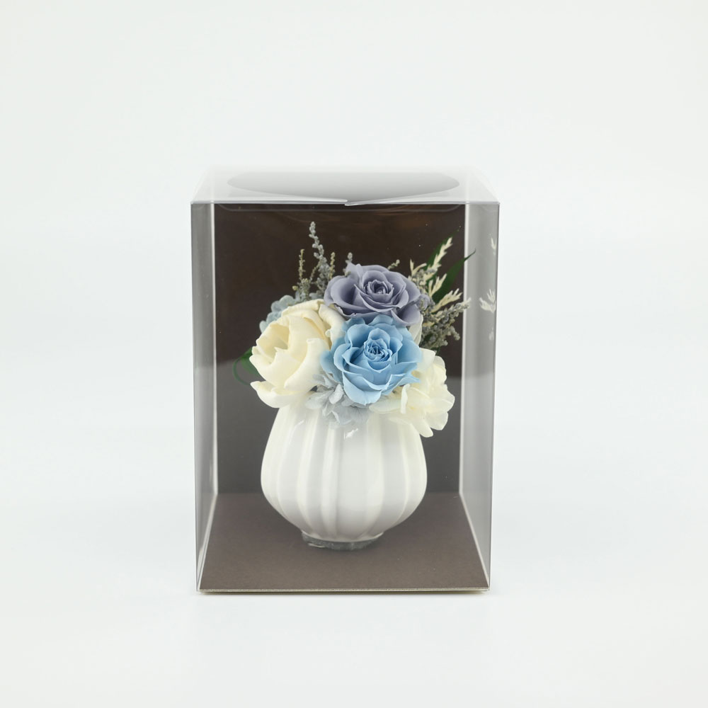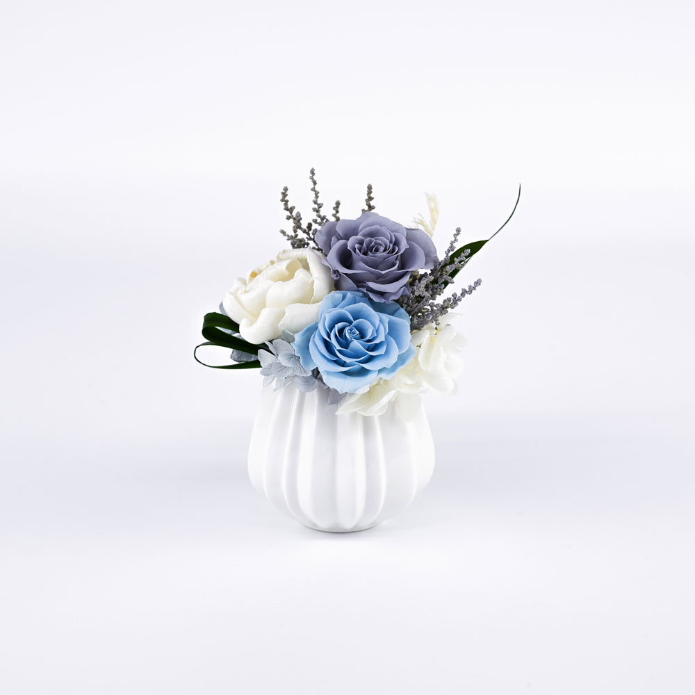 プリザーブドフラワーと可愛いホワイト花器を組み合わせたアレンジメント。