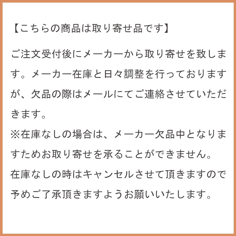 | 注意事項 | ※北海道、沖縄、離島は別途送料が必要となります。 ※メーカー直送&取寄せ品となり在庫状況は反映されておりません。在庫切れの場合もございますので予めご了承下さい。お急ぎの場合は、ご注文前に在庫確認をお願いいたします。 |