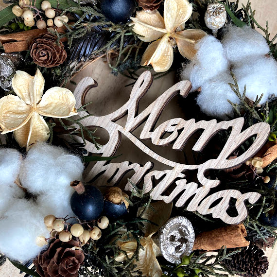 Merry Christmasのウッドの飾りがアクセントで可愛いです。