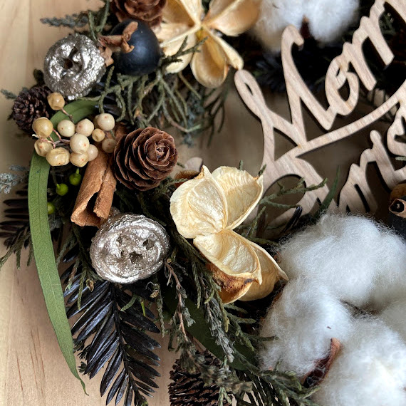 大きさも、玄関やリビングのちょっとしたスペースに飾っていただけるコンパクトサイズ。雑貨やキャンドルと共にクリスマステーブルに飾るのも素敵です。自然素材で作られているので、アーティフィシャルのようなテカリはなく上品なリースになります。