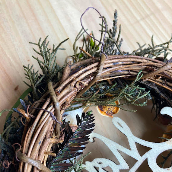グリーンのリースにドライや木の実を使って森をイメージ。