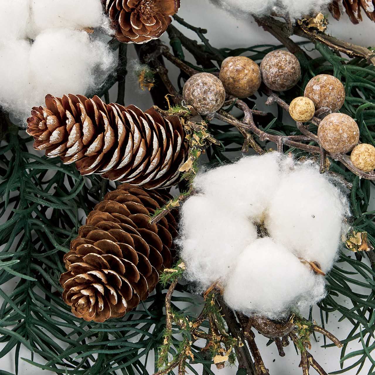 天然素材の松かさとナイロン製のコットン、アーティフィシャルのアイボリーからブラウンの実が付いた優しい色味のスワッグです。
