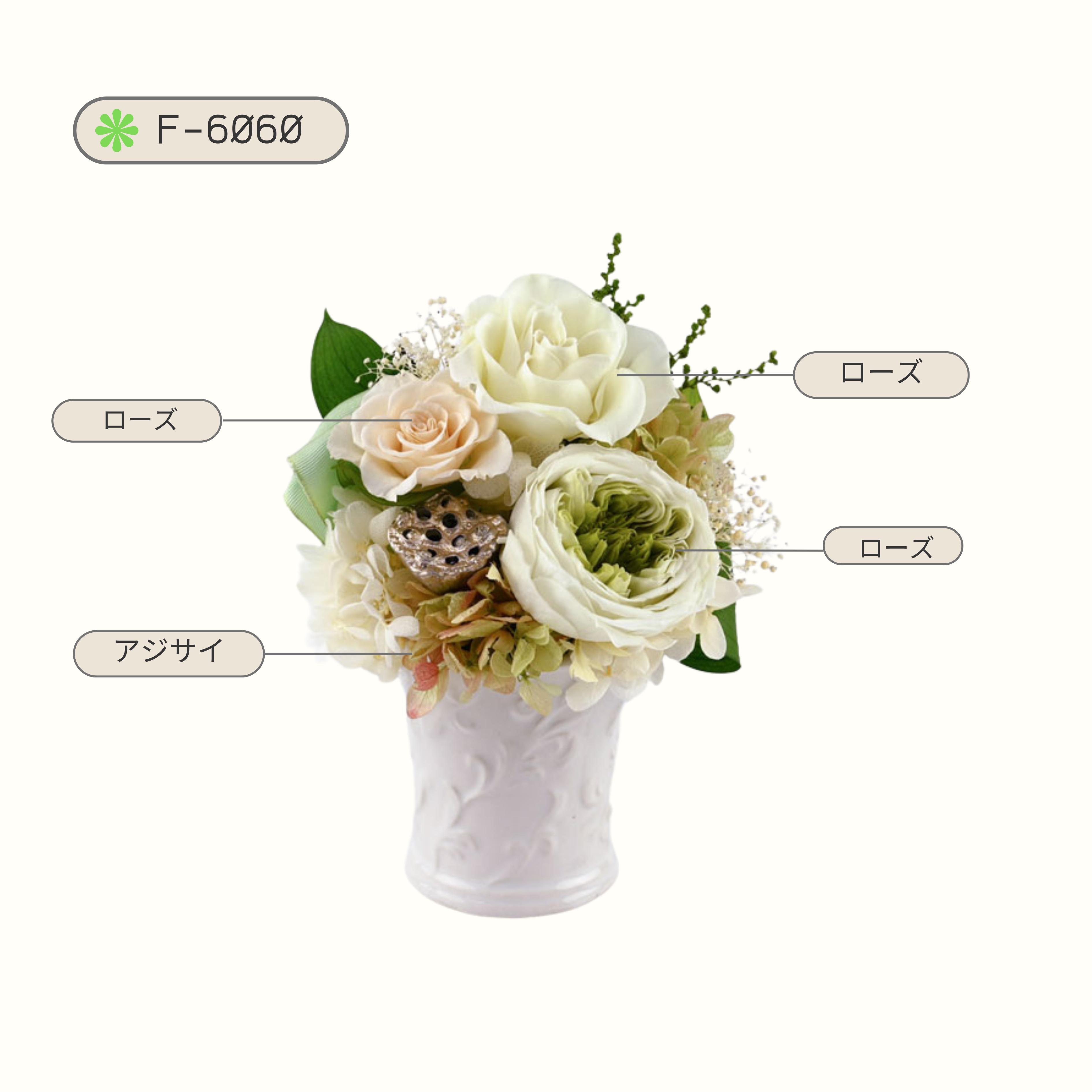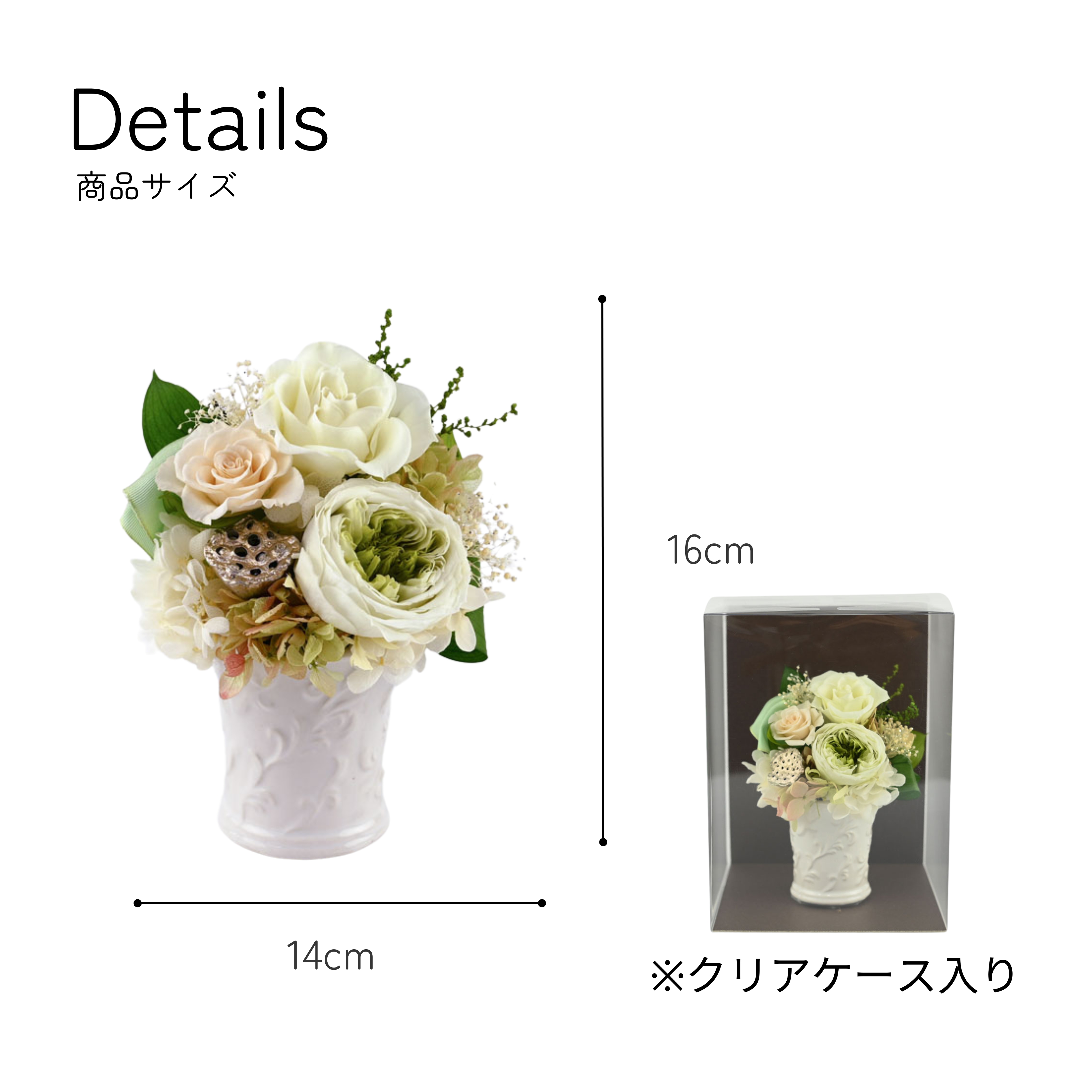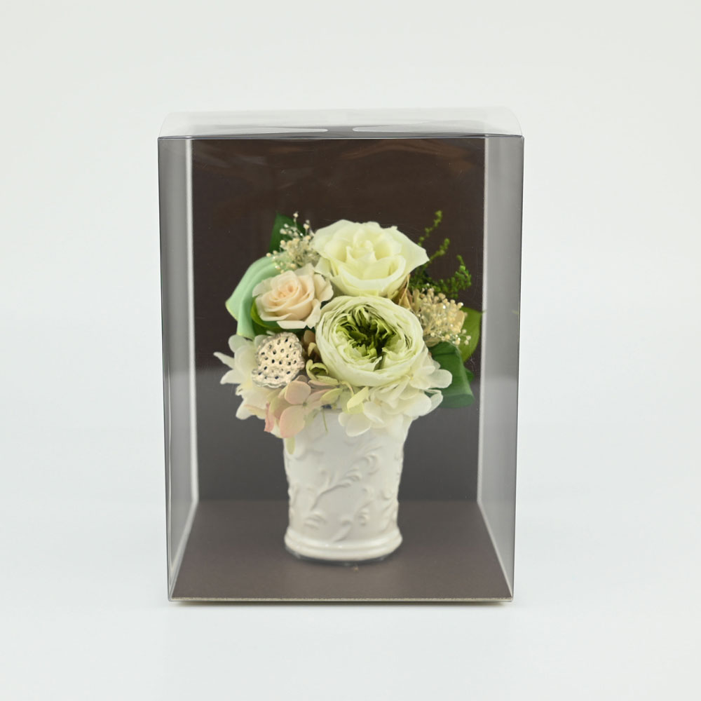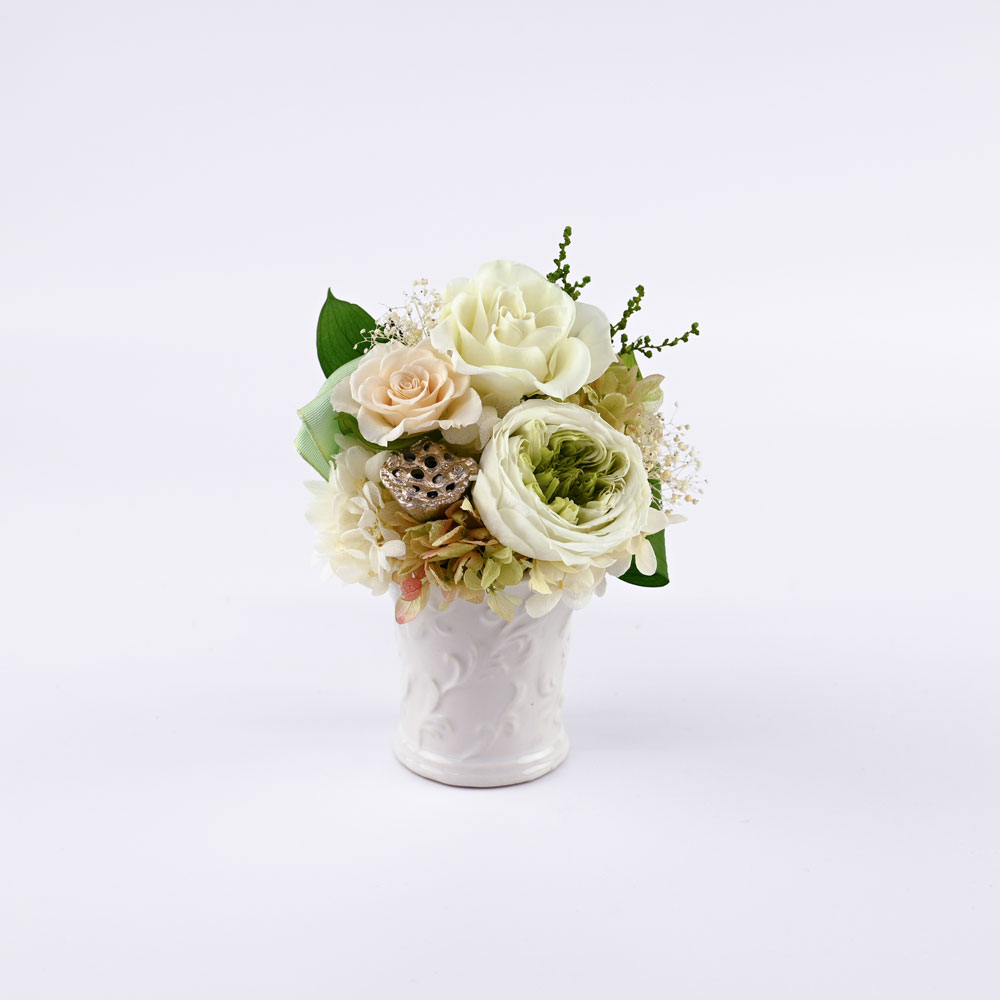 プリザーブドフラワーと可愛いホワイト花器を組み合わせたアレンジメント。