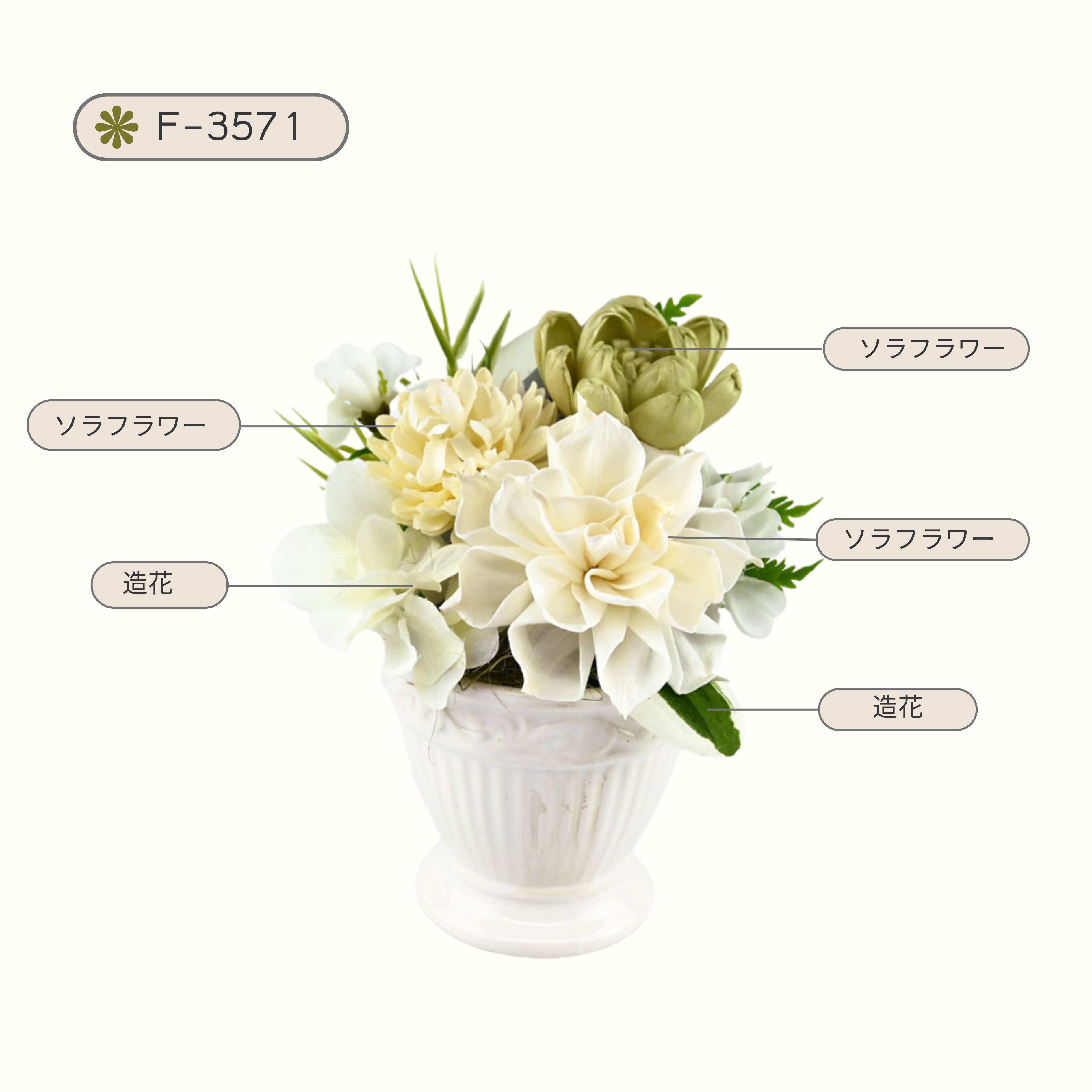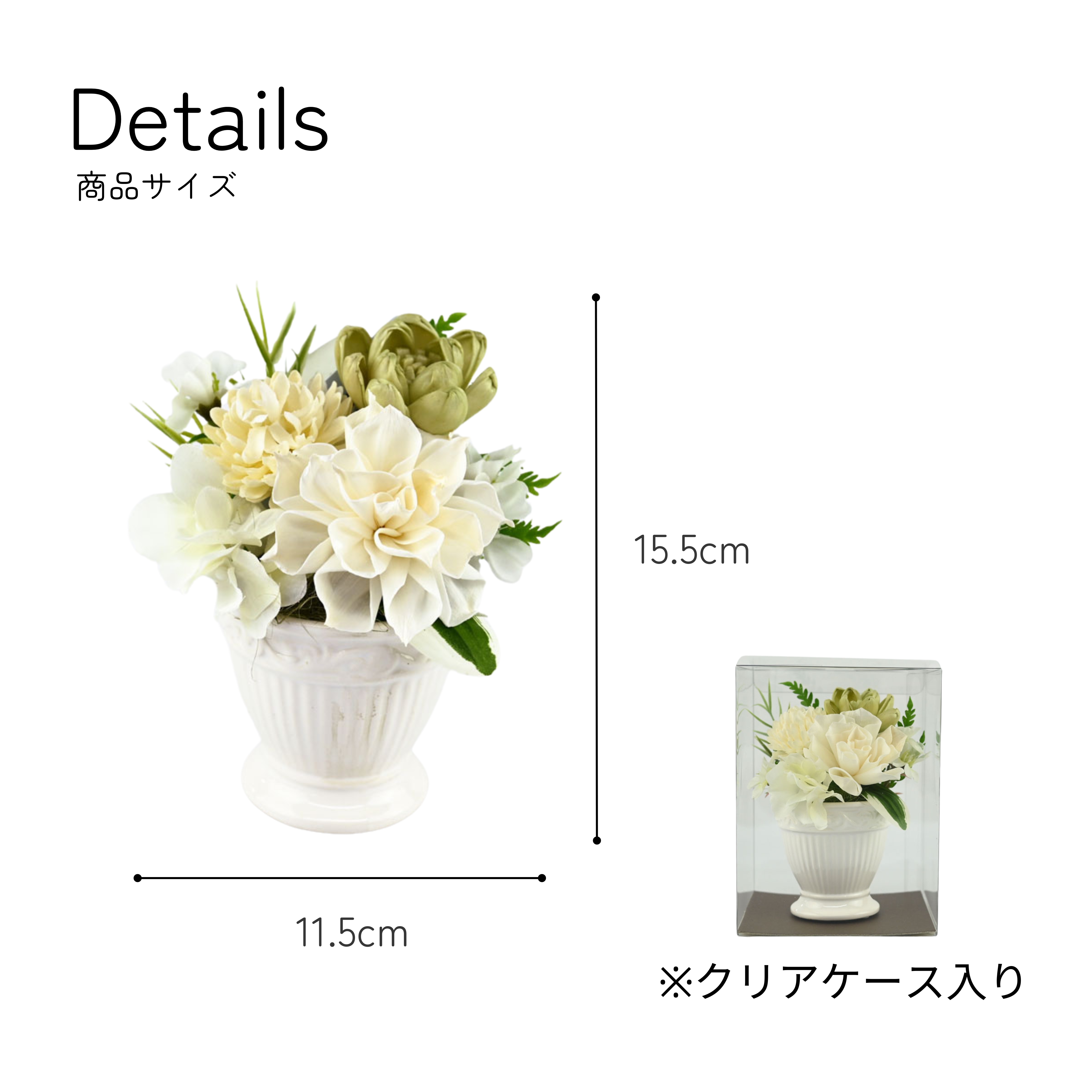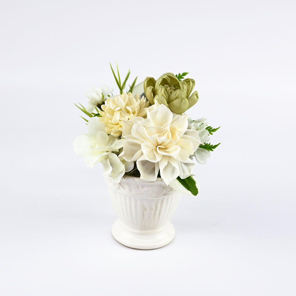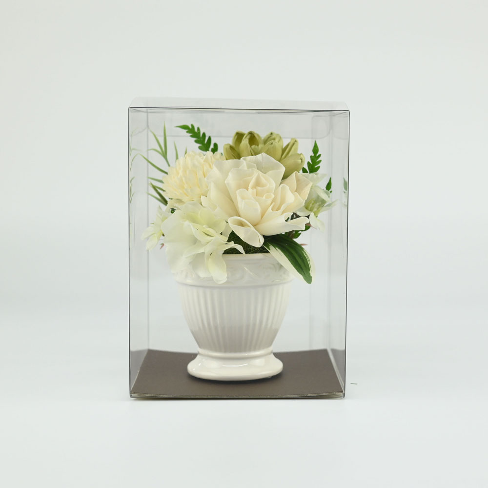プリザーブドフラワーと可愛いホワイト花器を組み合わせたアレンジメント。