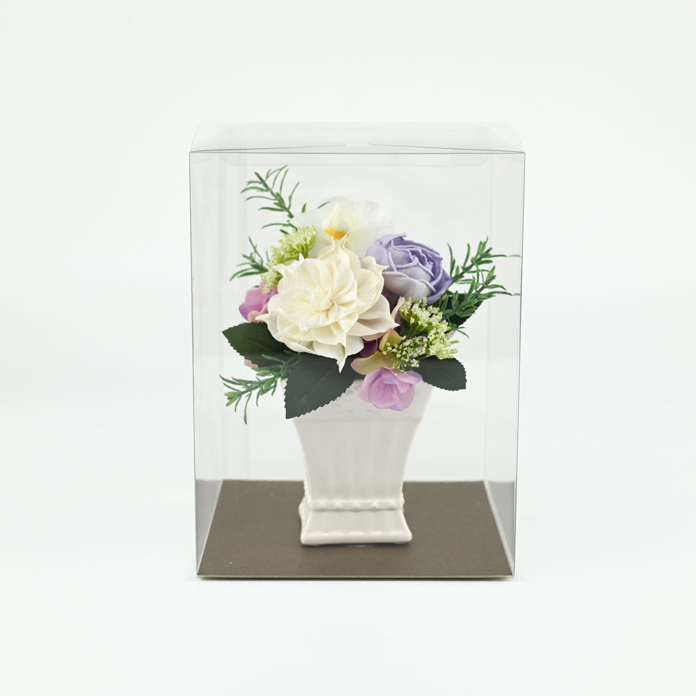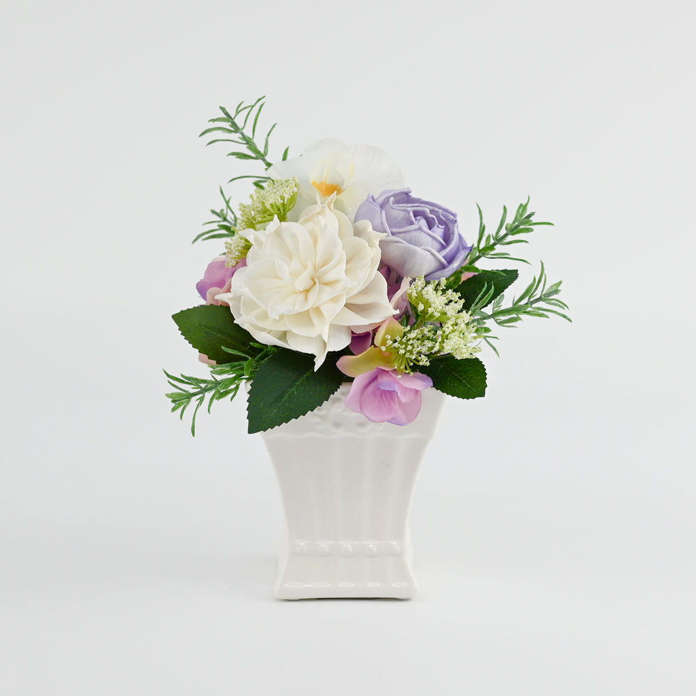 プリザーブドフラワーと可愛いホワイト花器を組み合わせたアレンジメント。