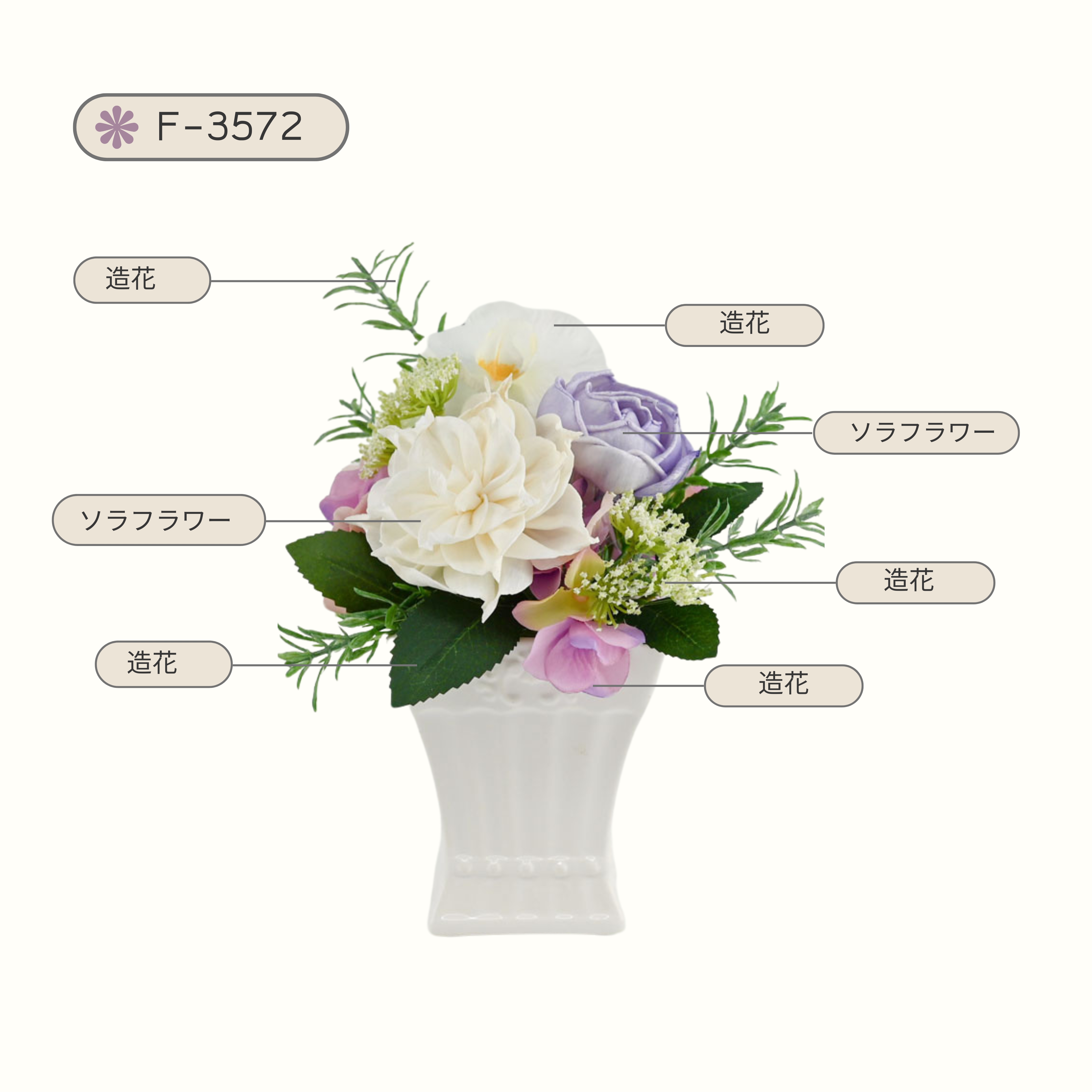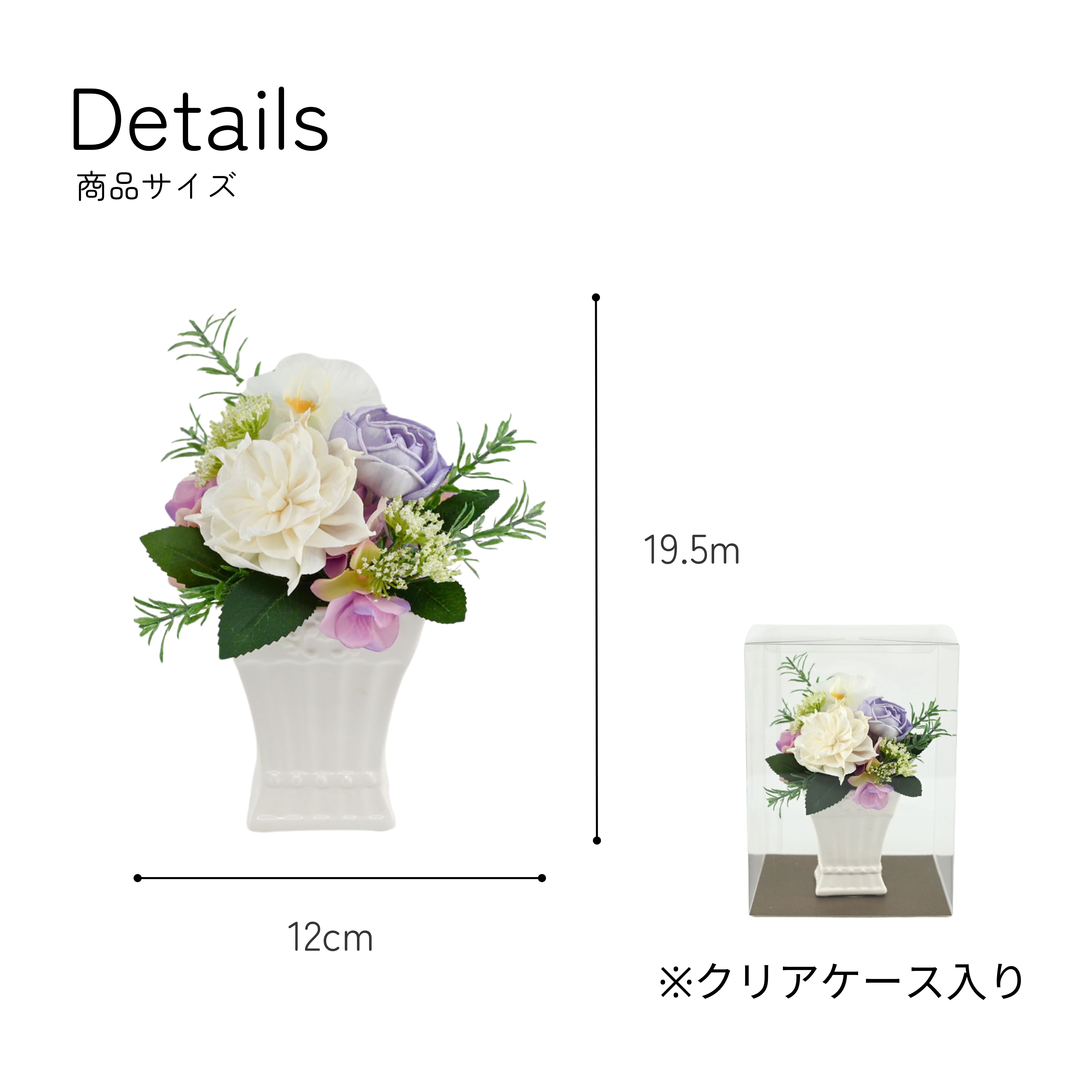 ソラフラワーと造花を華やかにアレンジした仏花。シンプルな白い花器がお花を引き立てます。自然の素材であるソラの木を使用したことで、質感と雰囲気が一層引き立っています。