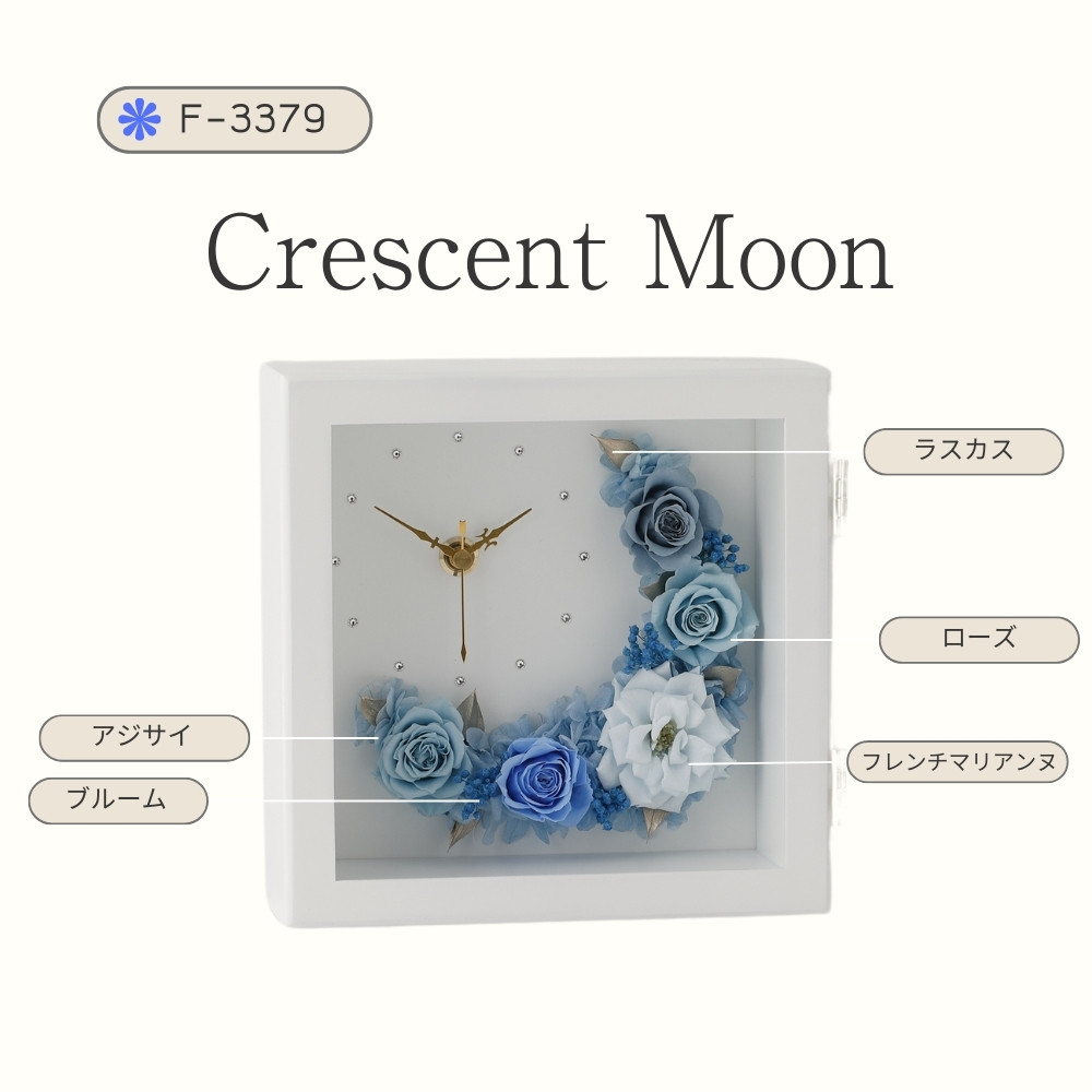 バラとあじさいを使った写真立てつき花時計のプリザーブドフラワーです。クリスタルガラスの文字盤と三日月をイメージした神秘的なアレンジが美しく、大切な人との大切な時間を刻む華やかな時計です。