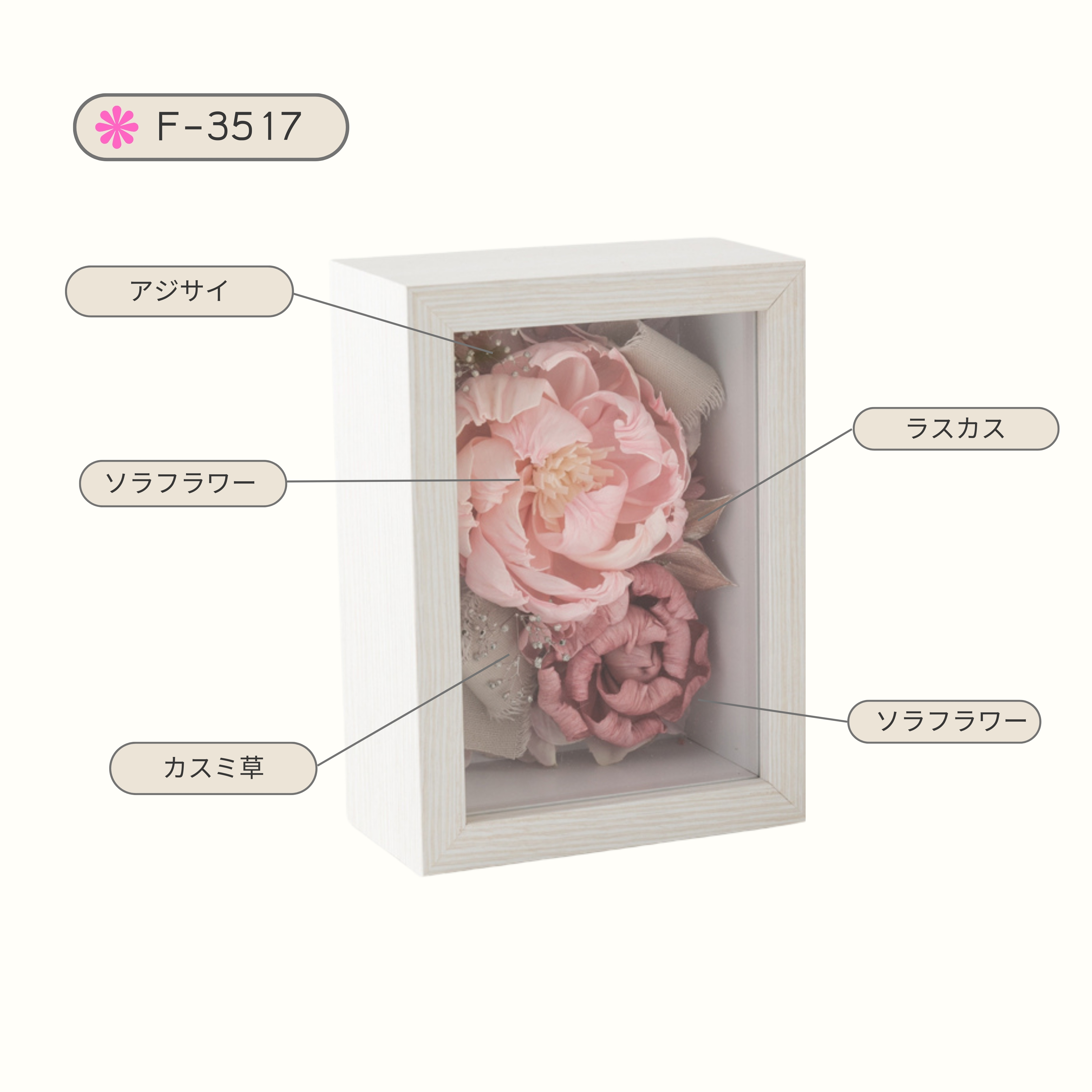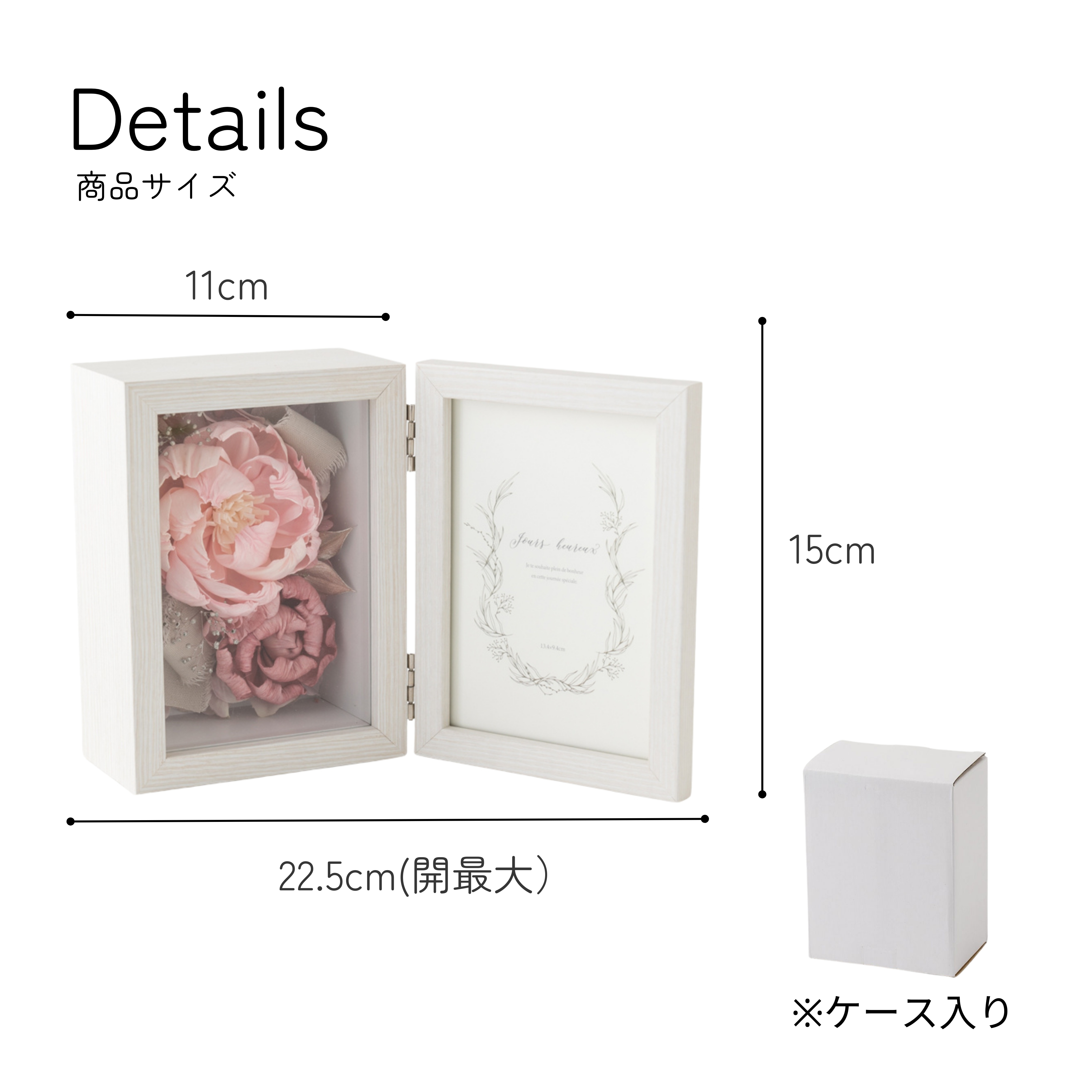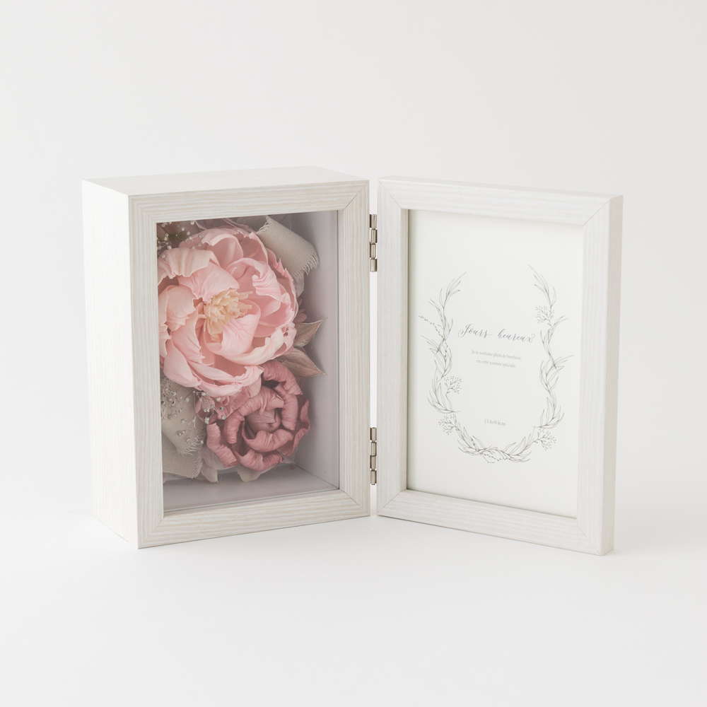 正方形のボックスにプリザーブドフラワーを敷き詰め、写真と一緒に飾れるお洒落なアイテム。