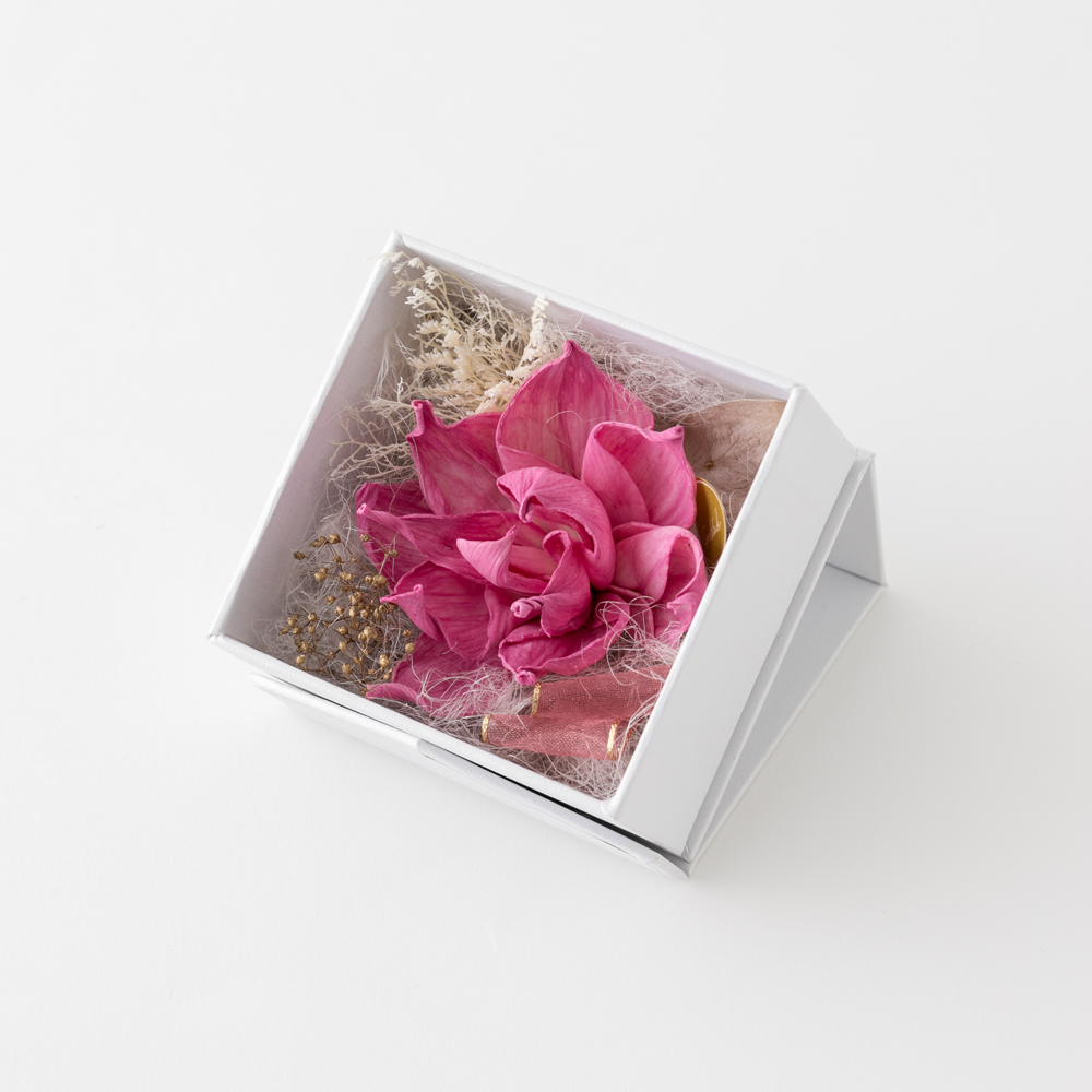 正方形のボックスにプリザーブドフラワーを敷き詰め、写真と一緒に飾れるお洒落なアイテム。