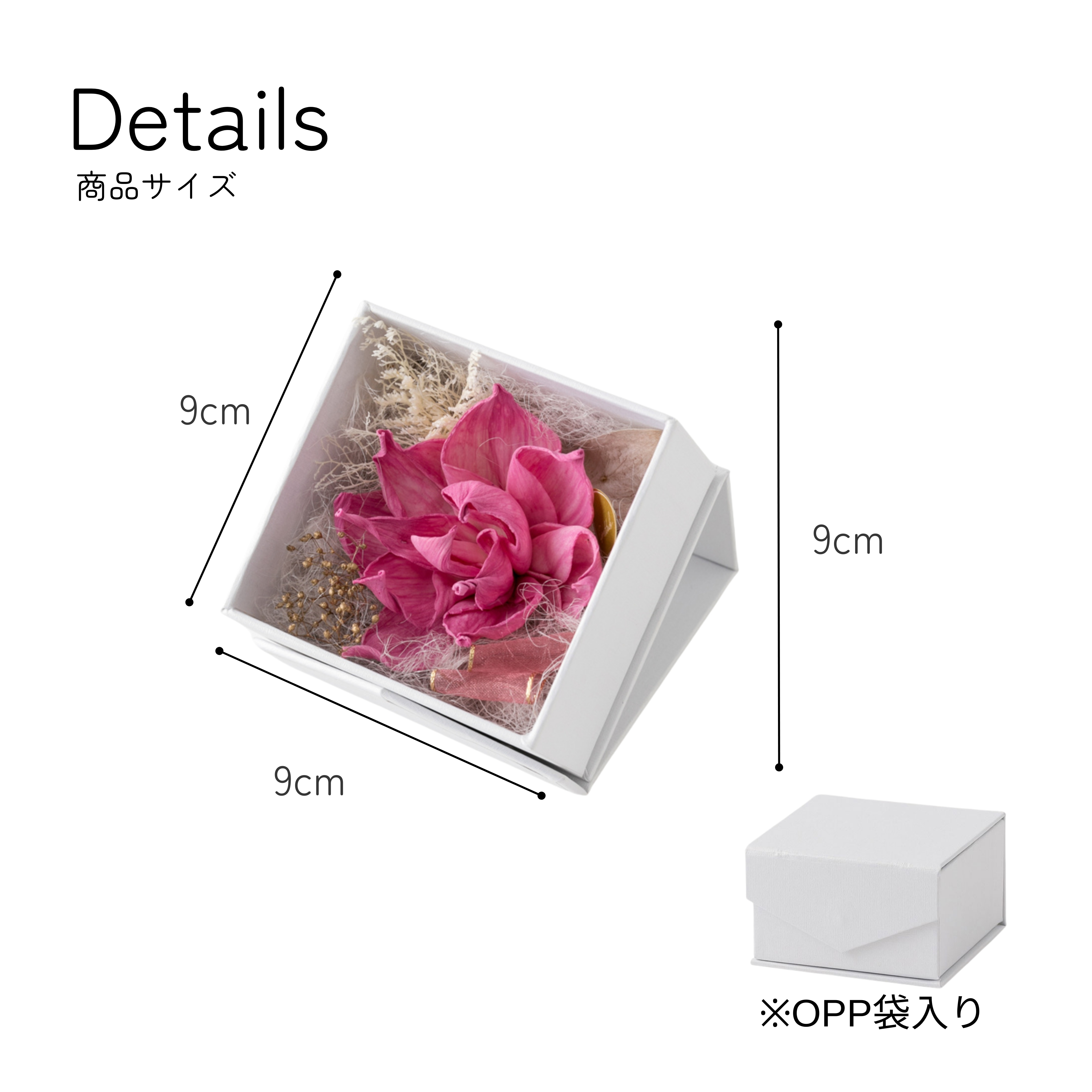 | サイズ | 幅9cm×奥9cm×高9cm(開けた状態)/幅9cm×奥9cm×高5.5cm(閉じた状態) |