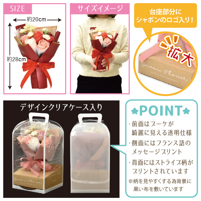 ラッピングのカラーリングにも拘ったソープフラワーのブーケ。デザインクリアケース入りなのでそのままギフトとしてもおすすめ。花びら1枚1枚がせっけんの素材で出来た観賞用のお花です。