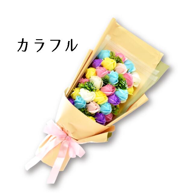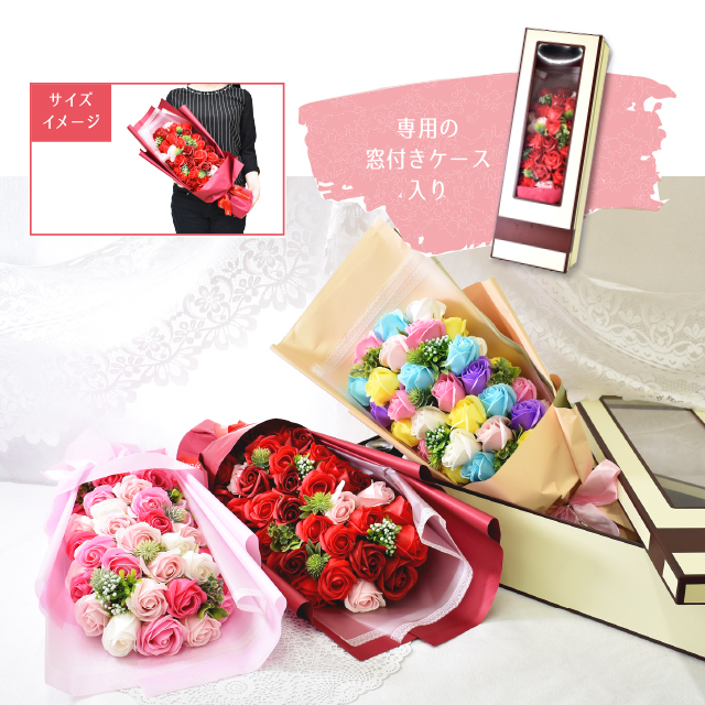 カラフルな薔薇にアクセントのグリーンをあしらった、美しいカラーリングの大きめのソープフラワーブーケ。専用ケース入りなのでそのままプレゼントにも最適。花びら1枚1枚がせっけんの素材で出来た観賞用のお花です。
