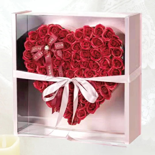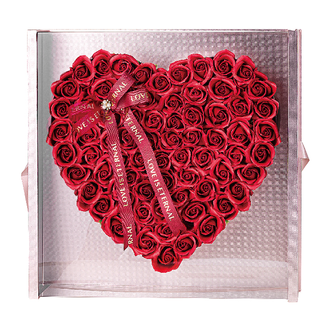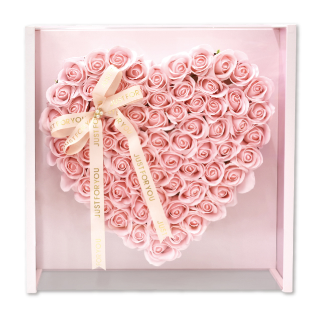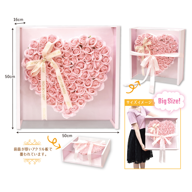 超BIGサイズえインパクトのあるハート型のソープフラワー。沢山のローズを可愛くハート形にして豪華なケースに詰め込みました。花びら1枚1枚がせっけんの素材で出来た観賞用のお花なので、お祝いやプレゼント、ギフトにおすすめ。
