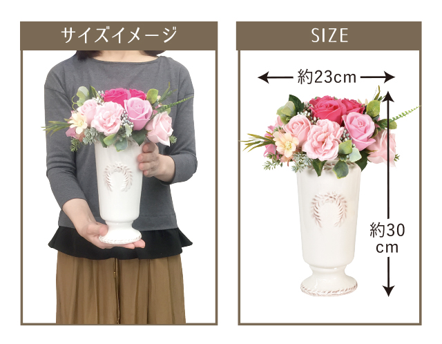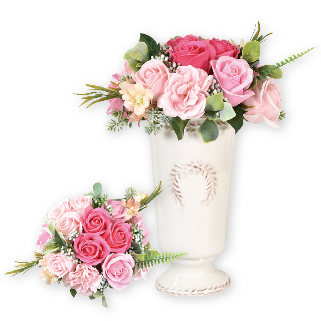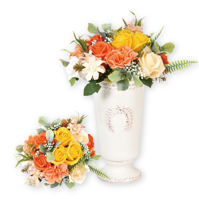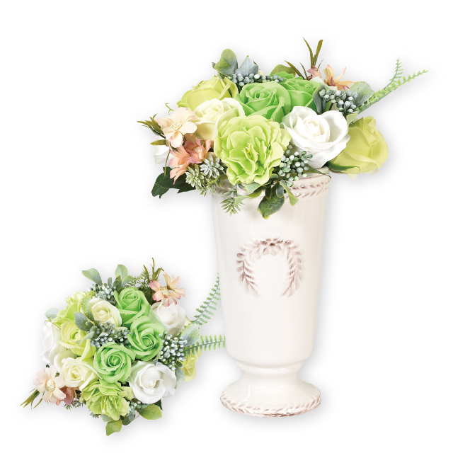 プリザーブドフラワーと可愛いホワイト花器を組み合わせたアレンジメント。